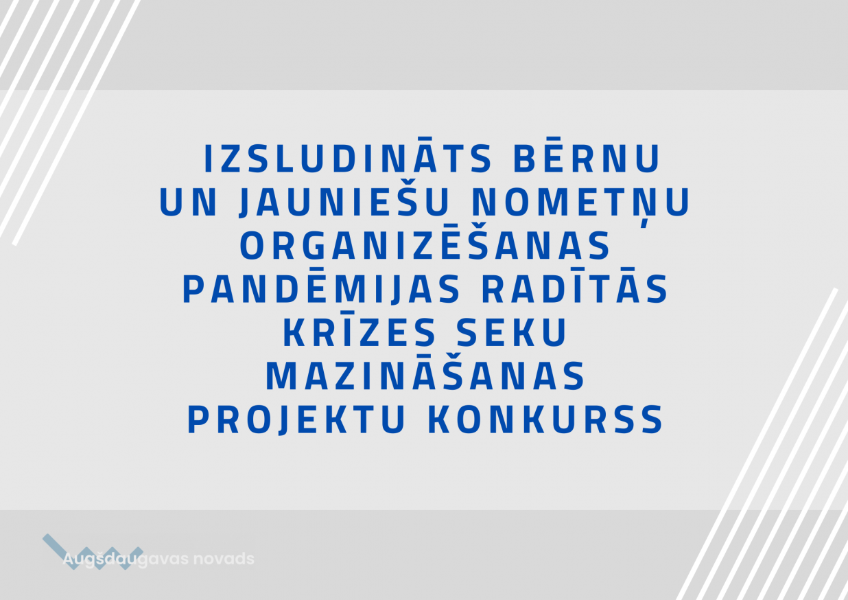 Krīzes seku mazināšanas projektu konkurss12.07.2021Pašvaldība Ar 12.jūliju tiek izsludināts Bērnu un jauniešu nometņu organizēšanas Covid-19 pandēmijas radītās krīzes seku mazināšanas projektu konkurss. Pieteikumi jāiesniedz līdz 16.jūlijam plkst. 12.00. Pieteikums Nolikums