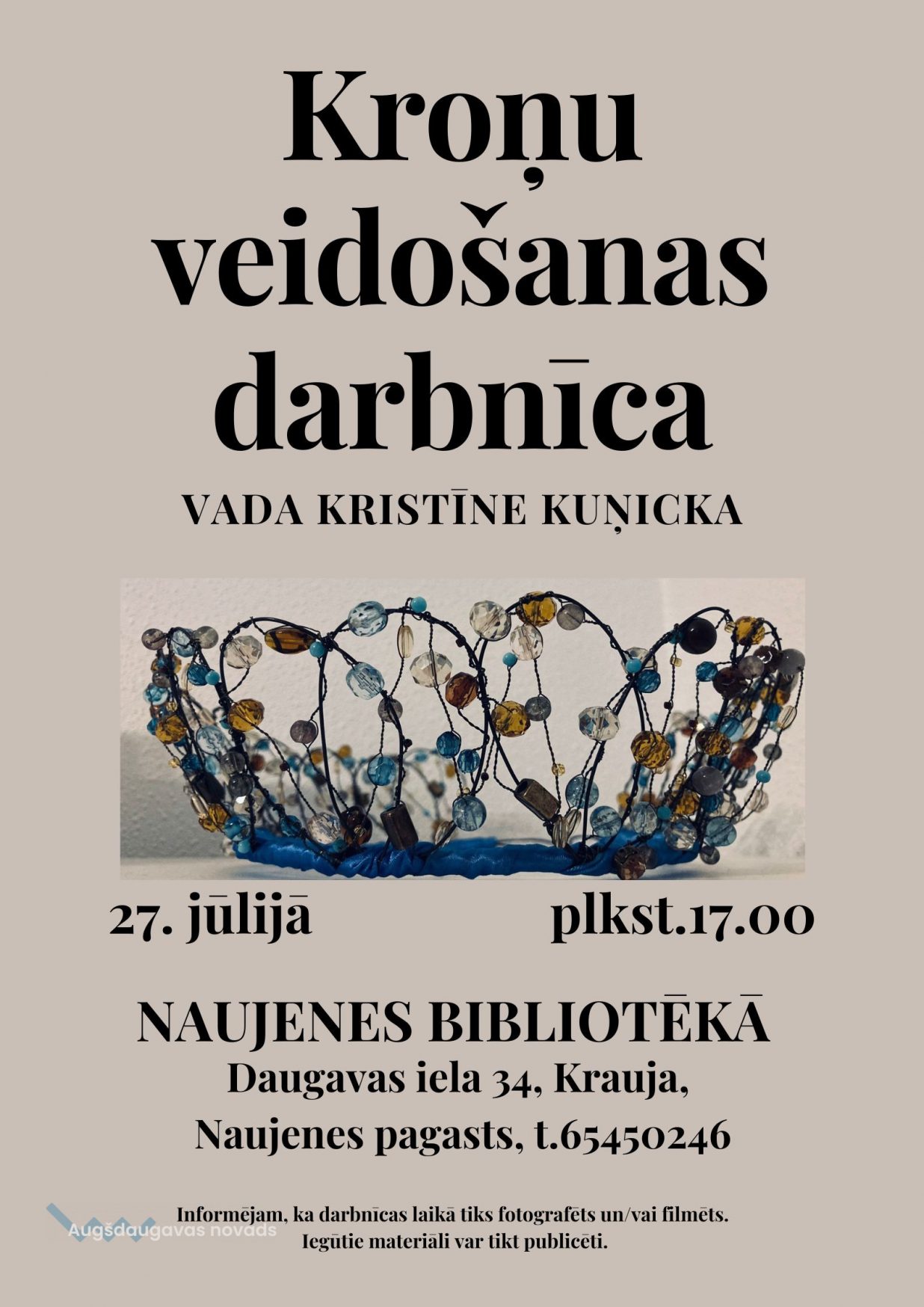 Tiekamies Kroņu veidošanas darbnīcā Naujenes bibliotēkā pēc adreses Daugavas ielā 34, Krauja, Naujenes pagasts, tālr. uzziņām 65450246.