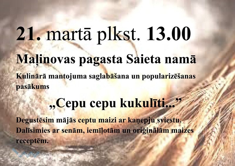 Kulinārā mantojuma pasākums “Cepu, cepu kukulīti”15.03.2018Kultūra 21.martā plkst. 13.00 Maļinovas pagasta Saieta namā visi aicināti uz kulinārā mantojuma saglabāšanas un popularizēšanas pasākumu. Dalīsimies maizes receptēm, degustēsim pašceptu maizi ar kaņepju sviestu.Visi laipni aicināti!