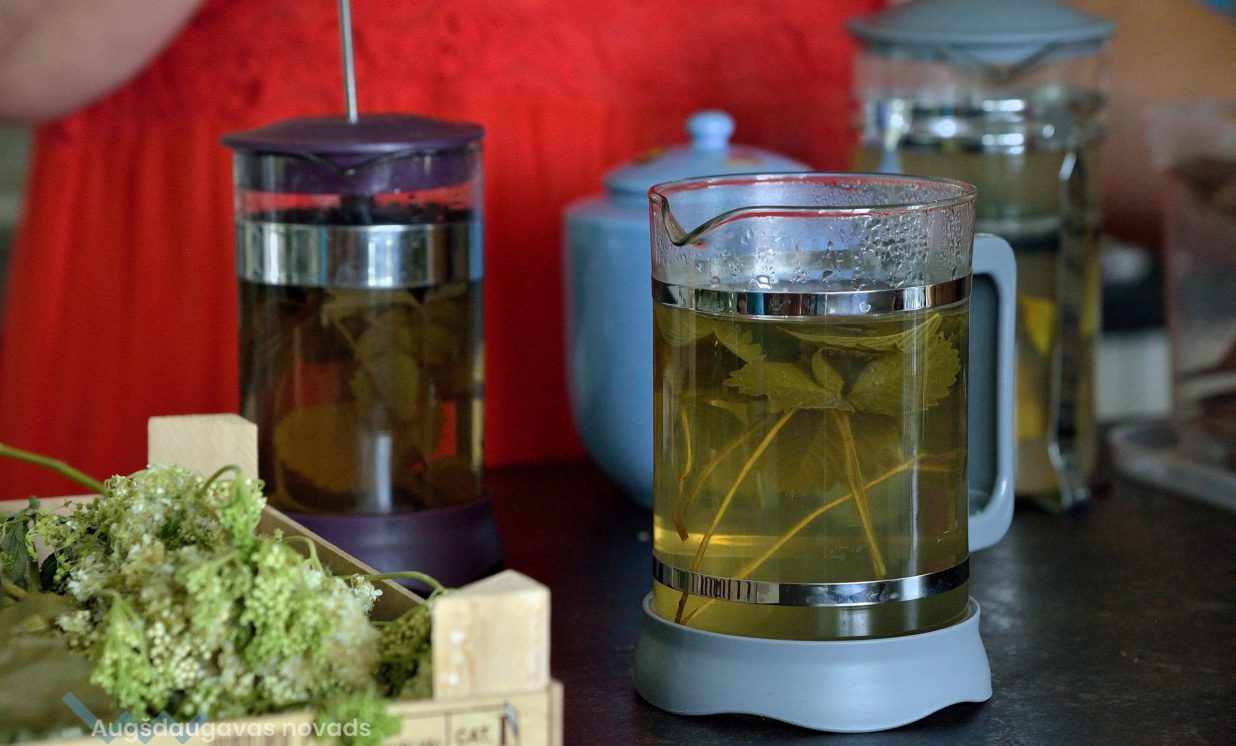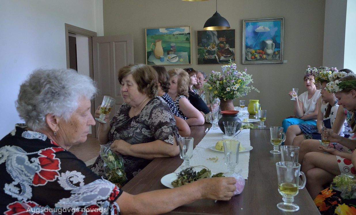 Uz siera siešanas meistarklasi bija ieradušies daudzi skatītāji un siera degustētāji, kas meistarklases laikā tika nogaršot arī daudzveidīgās zāļu tējas, kuras pagatavoja biedrības “Zaļā krūze” pārstāves Vineta Era un Jolanta Bāra. Vineta Era stāsta, ka Jāņu sieri vislabāk garšojot ar tējām, kas pagatavotas no Saulgriežu laikā ievāktām zālēm, kurām piemīt īpašs spēks. “Vislabāk ir ievākt zāles, kad tām ir ziedēšanas laiks. Liepziedi, lapas no augiem, kas zied, kā arī zāles, no kurām tapis Jāņu vainags. Tās var izžāvēt un vārīt arī pēc svētkiem. Arī nopļautā siena smalkumus var žāvēt un izmantot tējas pagatavošanā. Tā top tēju maisījumi, kas satur ļoti daudz vērtīgu vielu. Ļoti vērtīgi ir malvas ziedi, bet diemžēl uz Jāņiem tie vēl nezied”, stāsta Vineta.