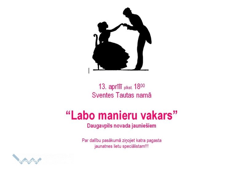 13.aprīlī plkst. 18.00 Sventes Tautas namā notiks “Labo manieru vakars". Par dalību pasākumā lūdzu paziņot sava pagasta jaunatnes lietu atbildīgajam.