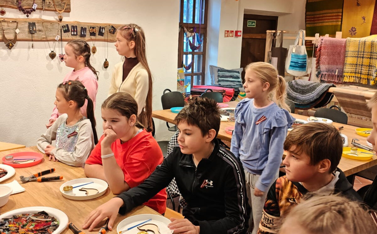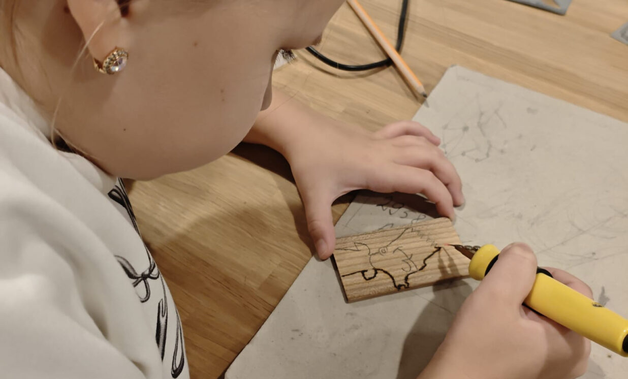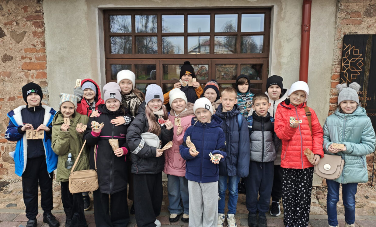 Nākamā bija koka darbnīca. Skolēni uzzināja, ka koks rokās nav tikai materiāls — tas kļūst par iedvesmas avotu. Katrs skolēns pats iededzināja savus zīmējumus un vārdus kokā. Visi bija sajūsmināti par Krāslavas Amatniecības centrā pavadīto dienu!
