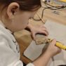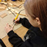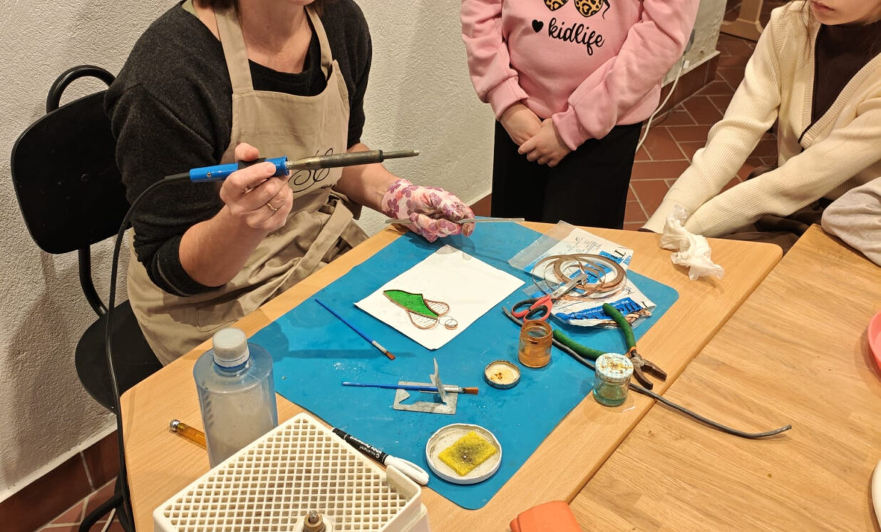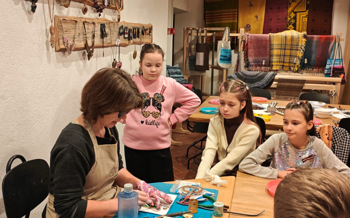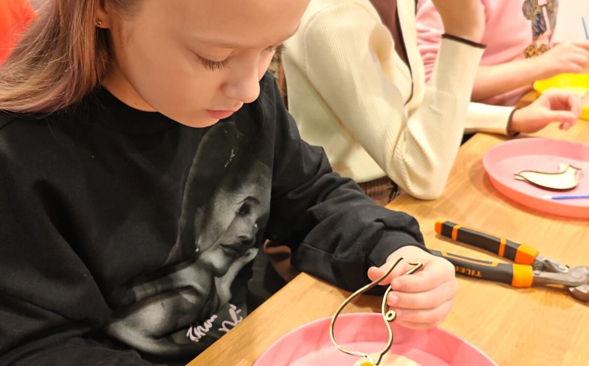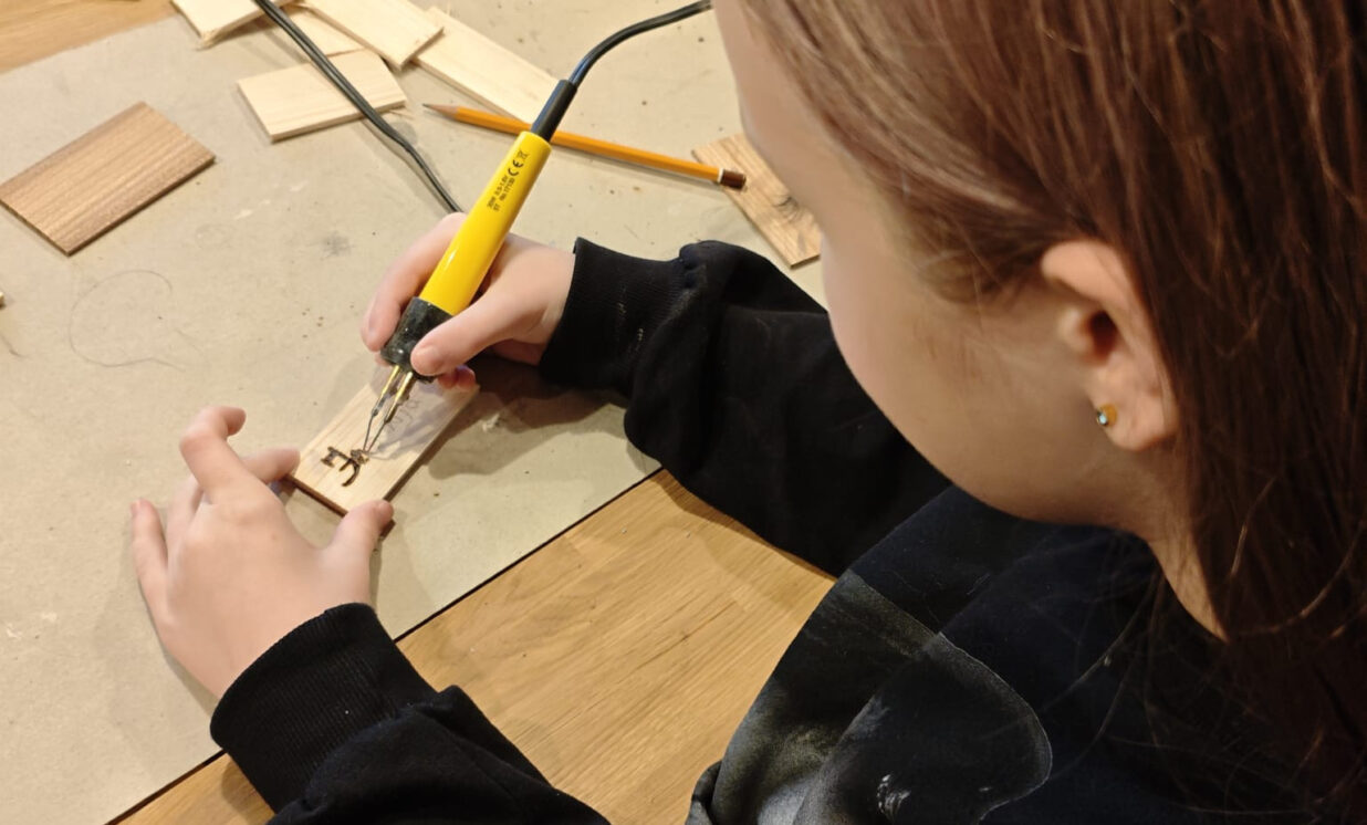 Nākamā bija koka darbnīca. Skolēni uzzināja, ka koks rokās nav tikai materiāls — tas kļūst par iedvesmas avotu. Katrs skolēns pats iededzināja savus zīmējumus un vārdus kokā. Visi bija sajūsmināti par Krāslavas Amatniecības centrā pavadīto dienu!