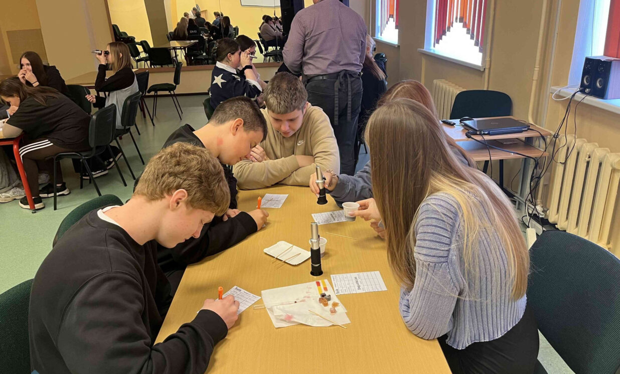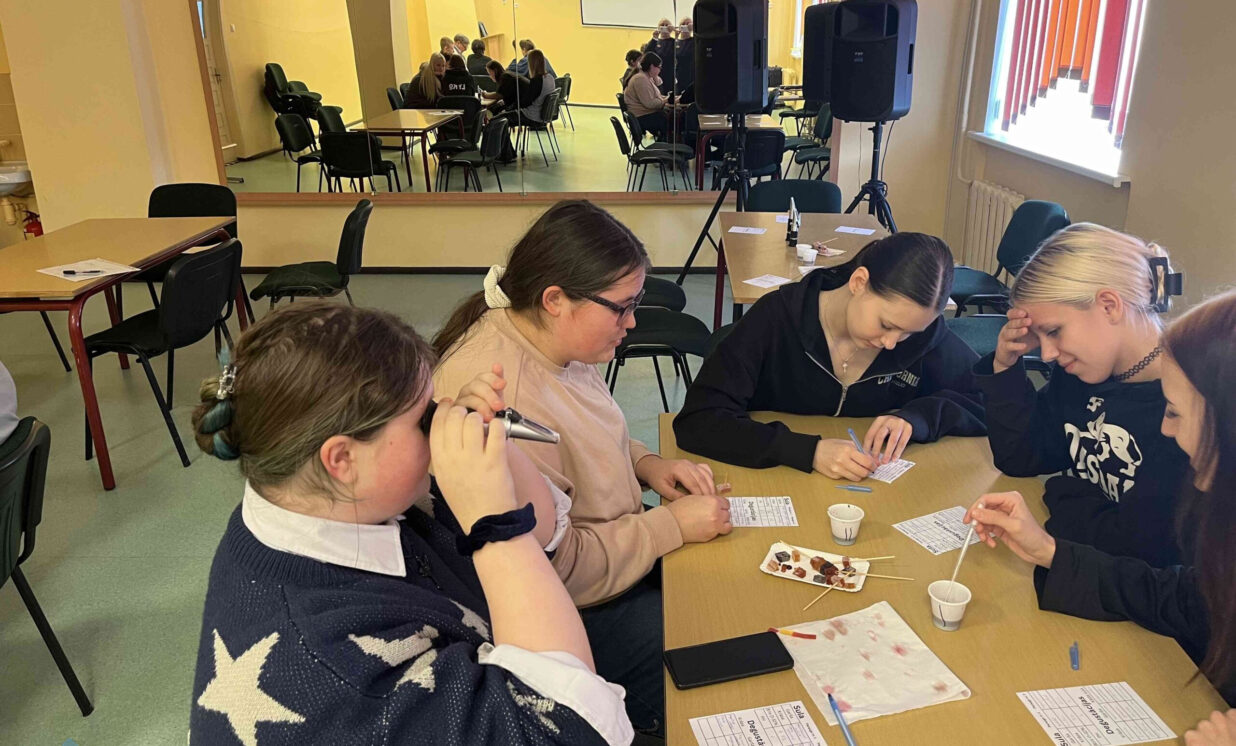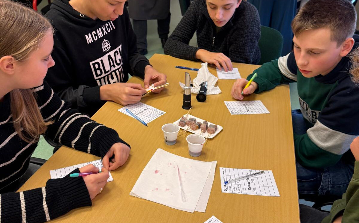 Vecāko klašu skolēni nodarbībā “No dabas veltēm līdz produktam” iepazinās ar pārtikas ražošanas procesu un kvalitātes kontroles nozīmi. Ievaddaļā jaunieši uzzināja par pārtikas tehnologa profesiju, darba pienākumiem un izmantotajiem instrumentiem, savukārt praktiskajā daļā paši iejutās pārtikas nozares speciālistu lomā. Ar refraktometru skolēni mērīja sulas cukura un pH līmeni, veica organoleptisko analīzi, aprēķināja nepieciešamo cukura daudzumu gala produktā un salīdzināja rezultātus. Darbojoties praktiski, skolēni attīstīja prasmes strādāt ar mēraparātiem (refraktometri 0–32% un +32% Brix), veikt aprēķinus un izvērtēt iegūtos datus. Nodarbība palīdzēja izprast, cik cieši ķīmija un tehnoloģijas saistītas ar ikdienas dzīvi, un atklāja karjeras iespējas pārtikas nozarē.