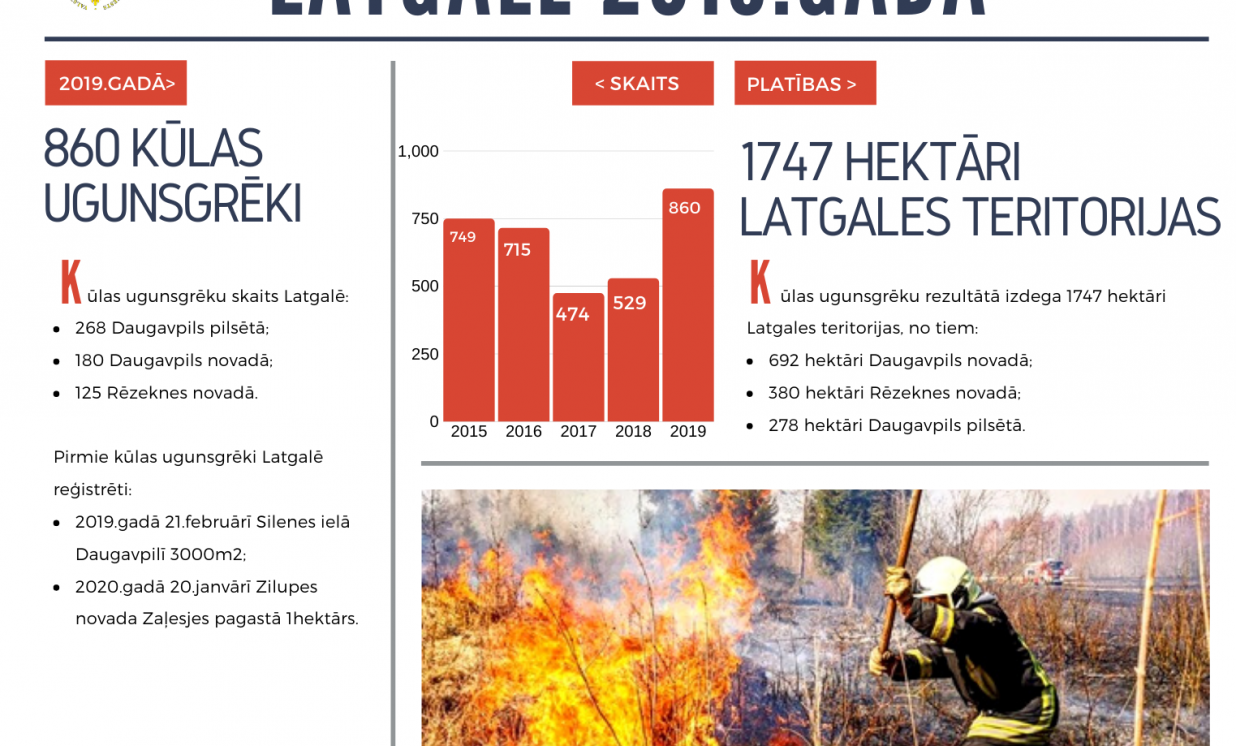 2019.gadā Latgalē reģistrēti 860 kūlas ugunsgrēki, kas ir par 331 kūlas ugunsgrēku vairāk nekā gadu iepriekš. Vislielākais kūlas ugunsgrēku skaits Latgalē pērn reģistrēts Daugavpils pilsētā – 268 kūlas ugunsgrēki, kā arī Daugavpils novadā - 180. Kopumā Latgalē pērn izdegušas 1747 hektārus lielas teritorijas – visvairāk Daugavpils (692hektāri) un Rēzeknes (380hektāri) novados, kā arī Daugavpils pilsētā (278hektāri). Pirmais kūlas ugunsgrēks pērn reģistrēts 21.februārī Daugavpilī, bet šogad 20. janvārī Zilupes novadā. 2019.gadā republikas pilsētās visvairāk kūlas ugunsgrēku bija tieši Daugavpilī – 268. Arī platības ziņā Daugavpils ar izdegušiem 278,9 hektāriem ierindojusies pirmajā vietā. Arī Rēzeknē, lai arī neliels, bet tomēr pieaugums kūlas ugunsgrēku skaitā.