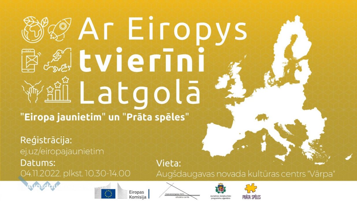 Dienvidlatgales NVO atbalsta centrs sadarbībā ar Eiropas Komisijas pārstāvniecību Latvijā,Jaunatnes starptautisko programmu aģentūru un Daugavpils pilsētas Izglītības pārvaldi2022. gada 4. novembrī Daugavpilī Augšdaugavas novada kultūras centrā "Vārpa" (Dobeles ielā 30) no pl. 10.30 līdz 14.30 pasākumu cikla "Ar Eiropys tvierīni Latgolā" ietvaros Latgales reģiona jauniešiem rīko izzinošu pasākumu divās daļās: “Eiropa jaunietim” un “Prāta spēles”.