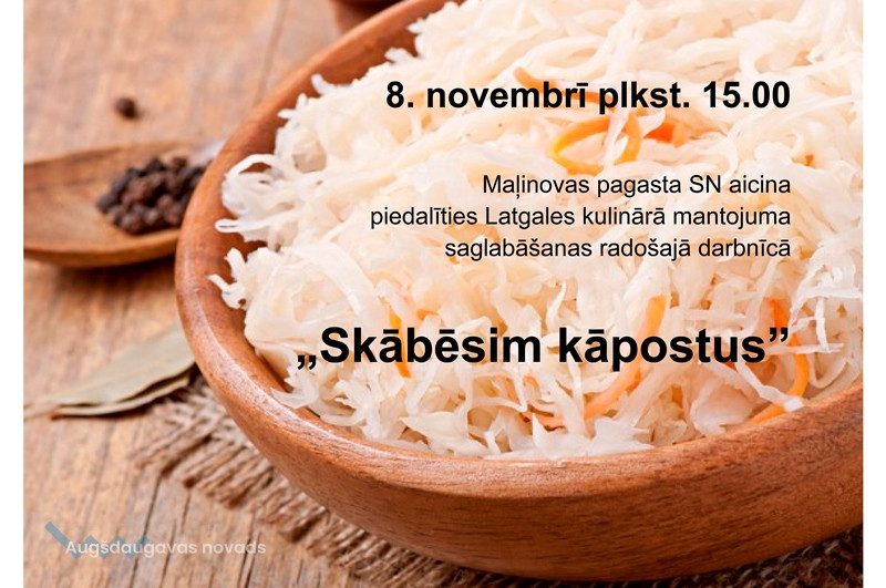 Aicinām visus interesentus piedalīties radošajā darbnīcā 8. novembrī plkst.15.00 Maļinovas pagasta saieta namā. Saimnieces tiek aicinātas dalīties pieredzē ar kāpostu skābēšanas receptēm. Laipni aicinām visus!
