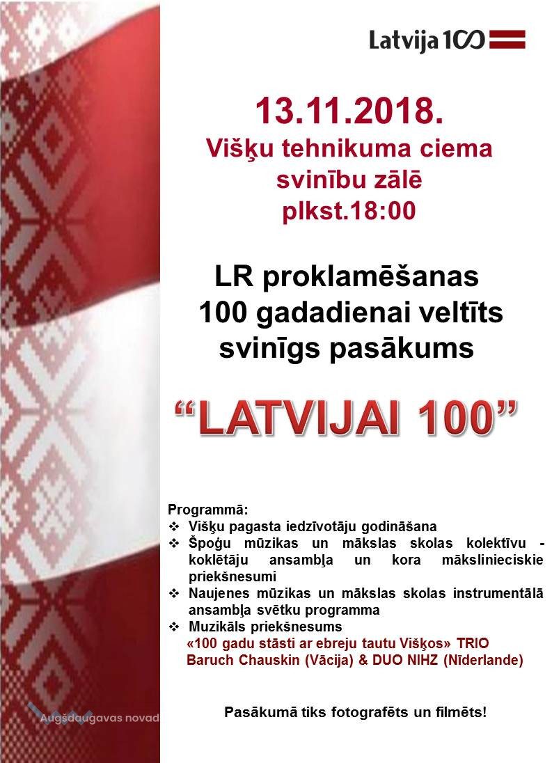 2018. gada 13. novembrī plkst. 18:00 Višķu pagasta Višķu tehnikuma ciema svinību zālē notiks LR proklamēšanas 100 gadadienai veltīts svinīgs pasākums "LATVIJAI 100"