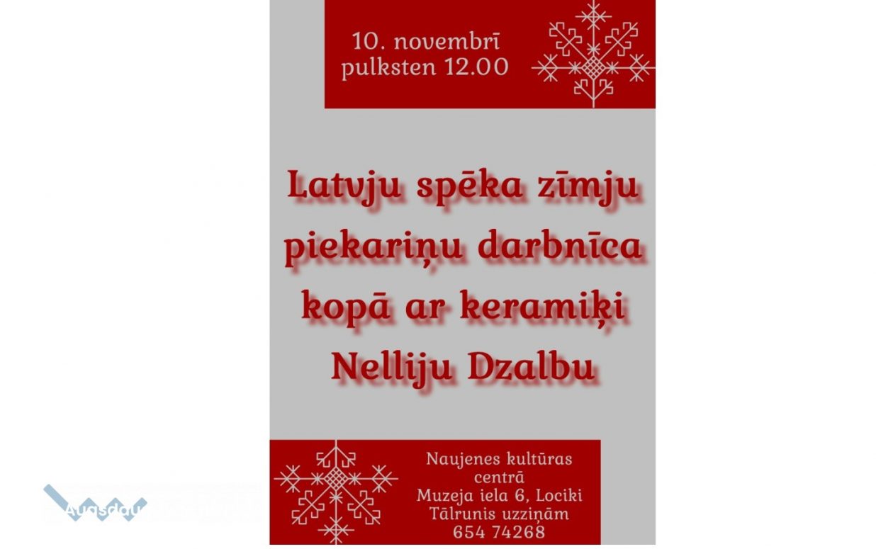 Lāčplēša dienas priekšvakarā nāksim radoši darboties! 10. novembrī plkst. 12.00 gaidīsim visus, visus Naujenes kultūras centrā (Muzeja iela 6, Lociki), kur katram būs iespēja izveidot piekariņu ar sev nozīmīgu un tuvu Latvju spēka zīmi. Darbnīcu vadīs keramiķe Nellija Dzalba.