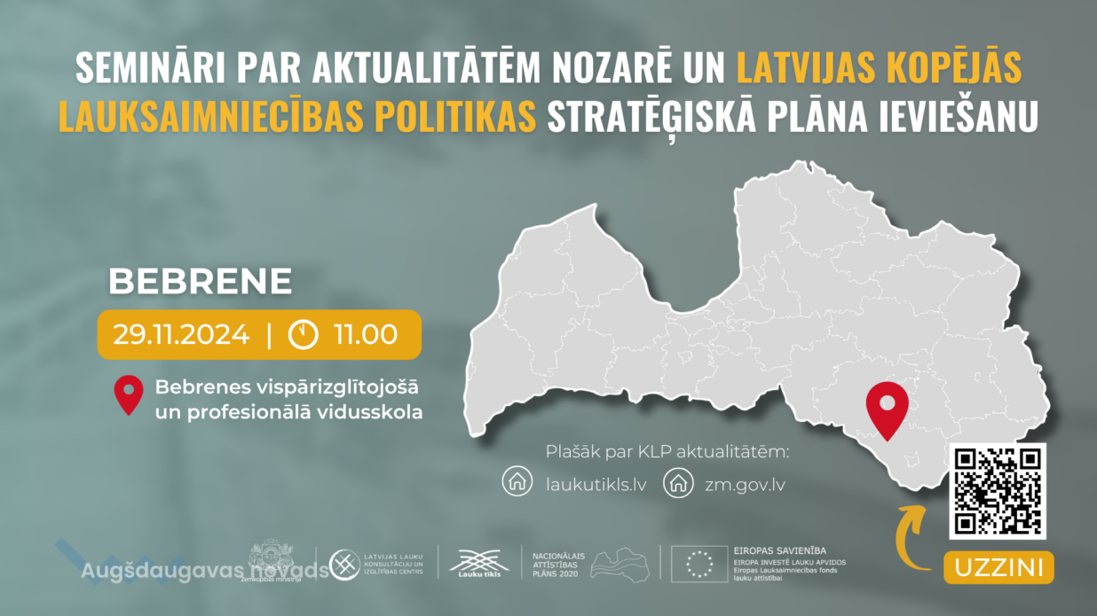 Piektdien, 29. novembrī, eksperti no Zemkopības ministrijas (ZM) un tās padotības iestādēm apmeklēs Bebreni, lai uzklausītu reģionālo lauksaimnieku jautājumus un informētu par aktualitātēm nozarē un Latvijas Kopējās lauksaimniecības politikas Stratēģiskā plāna (KLP SP) ieviešanā 2025. un turpmākajos gados. Seminārs notiks Bebrenes vispārizglītojošajā un profesionālajā vidusskolā, Bebrenes muižā, plkst. 11.00.