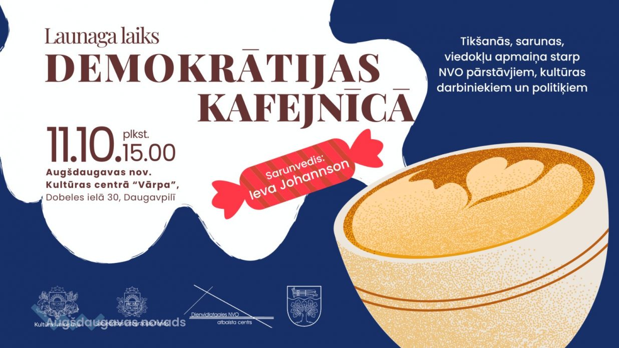Augšdaugavas novada Kultūras pārvalde sadarbībā ar biedrību “Dienvidlatgales NVO atbalsta centrs” 11. oktobrī plkst. 15.00 Augšdaugavas novada Kultūras centrā “Vārpa” organizē pasākumu “Launaga laiks Demokrātijas kafejnīcā”.