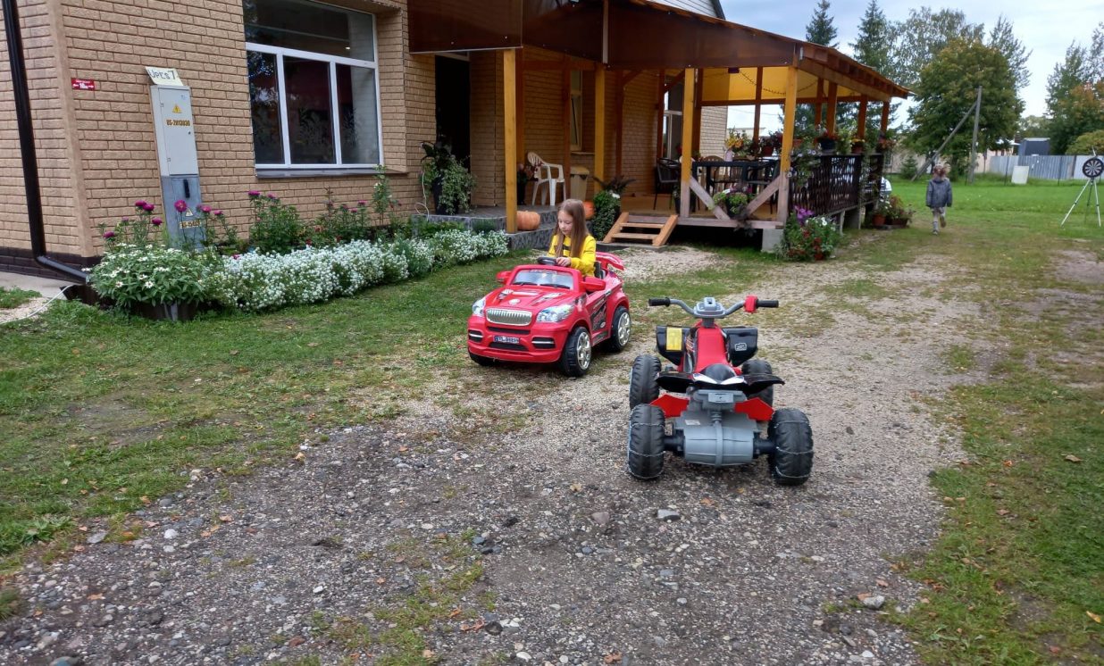Ciemiņus draudzīgi uzņem saimnieku labradors, bet saimniece Tatjana aicina nogaršot viņas īpašo kafiju un pašas gatavotos zefīrus. Sēžot gaišā kamīnzālē, grūti iedomāties, ka galda vietā vēl nesen atradusies bedre, bet durvju vietā bija sienā izlauzts caurums. Telpas, kas reiz piederējušas sadzīves pakalpojumu kombinātam, ģimene iegādājusies savā īpašumā pirms 20 gadiem. Abi ar vīru Aleksandru ilgi prātojuši, kā tās sakārtot un izmantot. “Idejas bija dažādas – gan audzēt trušus, gan ražot salmu briketes apkurei. Telpas bija šausmīgā stāvoklī,” saka Tatjana un rāda fotogrāfijas, kas uzņemtas pirms ēkas renovācijas un tās laikā. “Pagalmā salasījām izbirušas metāla ziedu lapiņas un es pat atradu sievieti, kura te kādreiz strādājusi un veidojusi metāla rozes,” stāsta Tatjana. Pamazām ģimene sakopj teritoriju, bet darba vēl esot ļoti daudz.