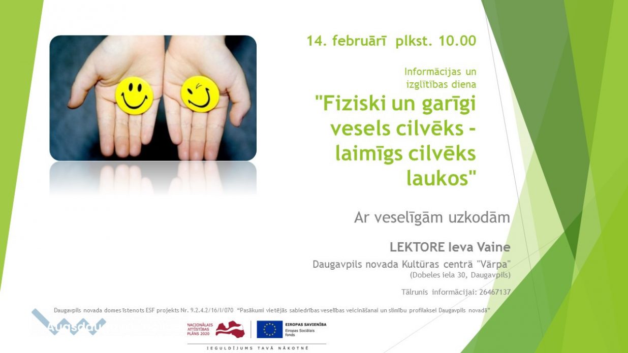 14. februārī plkst. 10:00 Daugavpils novada Kultūras centrā "Vārpa" notiks Informācijas un izglītības diena "Fiziski un garīgi vesels cilvēks - laimīgs cilvēks laukos". Lektore Ieva Vaine. Tālrunis informācijai 26467137 Pasākums tiek īstenots projekta “Pasākumi vietējas sabiedrības veselības veicināšanai un slimību profilaksei Daugavpils novadā”, Nr. 9.2.4.2/16/1/070, ietvaros.
