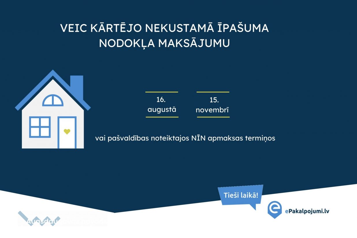 Atgādinām, ka līdz 2021. gada 16. augustam veicams kārtējais nekustamā īpašuma nodokļa (NĪN) maksājums. Saskaņā ar likumu „Par nekustamā īpašuma nodokli”, nekustamā īpašuma nodokļa maksājumi veicami vienu reizi ceturksnī ne vēlāk kā 31. martā, 17. maijā, 16. augustā un 15. novembrī vai kā katra pašvaldība lēmusi atbilstoši "Covid-19 infekcijas izplatības seku pārvarēšanas likuma" 5.pantā minētajām tiesībām 2021.gadā noteikt citus nekustamā īpašuma nodokļa samaksas termiņus, kas atšķiras no likumā "Par nekustamā īpašuma nodokli" noteiktajiem, tos pārceļot uz vēlāku laiku 2021. gada ietvaros.