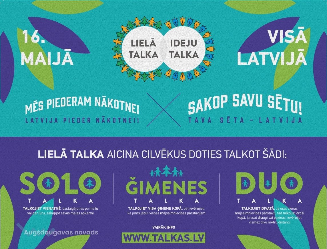 16. maijā visā Latvijā notiks Lielā Talka, taču šogad, ņemot vērā paaugstinātās drošības apstākļus un pašreiz noteikto sociālās distancēšanās aicinājumu, Lielā Talka tiek organizēta, lielāku uzsvaru liekot uz individuālo talkošanu, kas nozīmē arī vairāk individuālo talkas vietu pieteikumu.