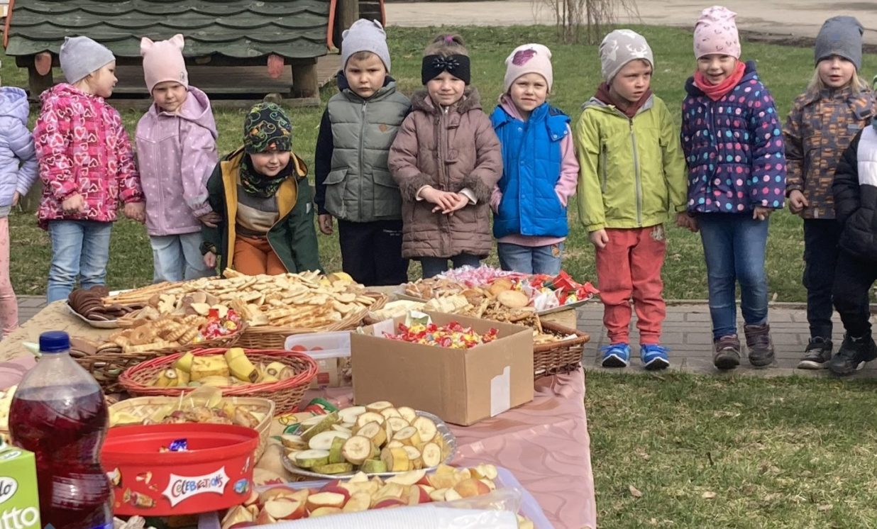 Svētku noslēgumā bērni cienājās kafejnīcā ar vecāku sarūpētajiem gardumiem.