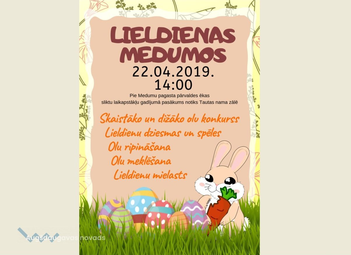 Aicinām pavadīt Otrās Lieldienas kopā, sanākot š.g. 22. aprīlī plkst. 14:00 pie Medumu pagasta pārvaldes ēkas! Pērn Lieldienu laikā Medumos tika novadīta meistarklase olu krāsošanā, tāpēc aicinām šogad piedalīties skaistāko un dižāko olu konkursā!