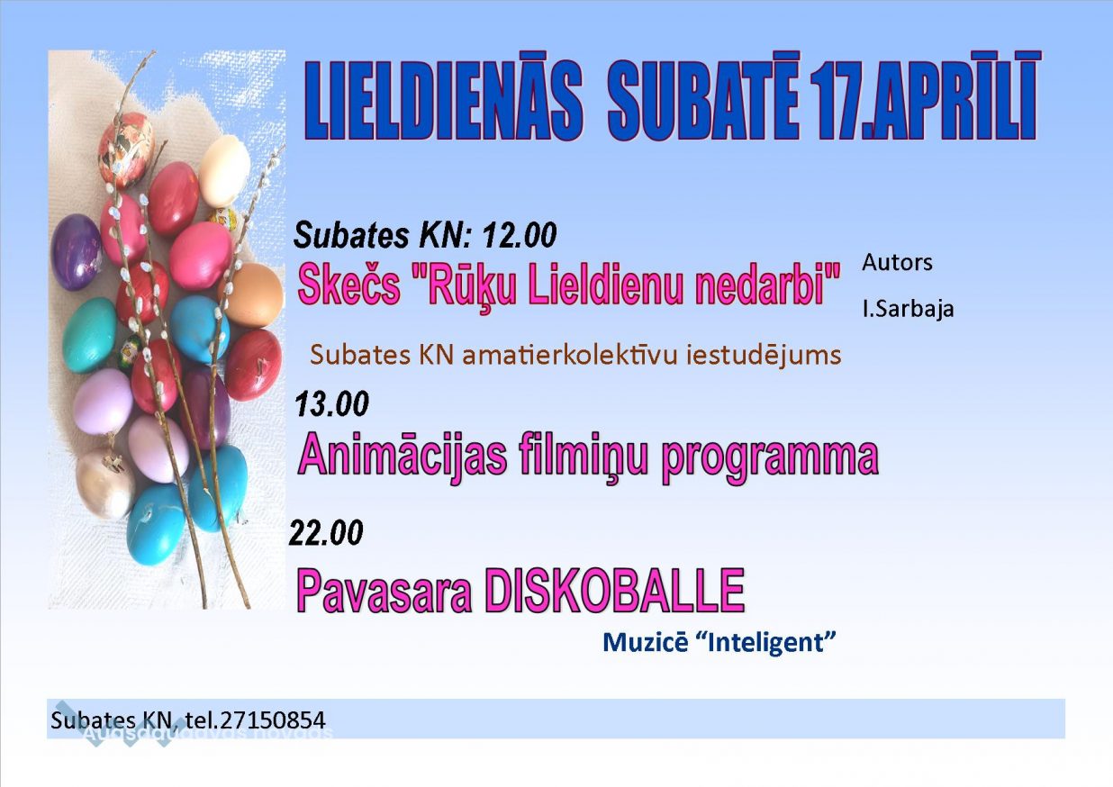 - 17. aprīlī plkst. 12.00 Skečs "Rūķu Lieldienu nedarbi" (autors: I. Sarbaja), Subates KN amatierkolektīvu iestudējums;