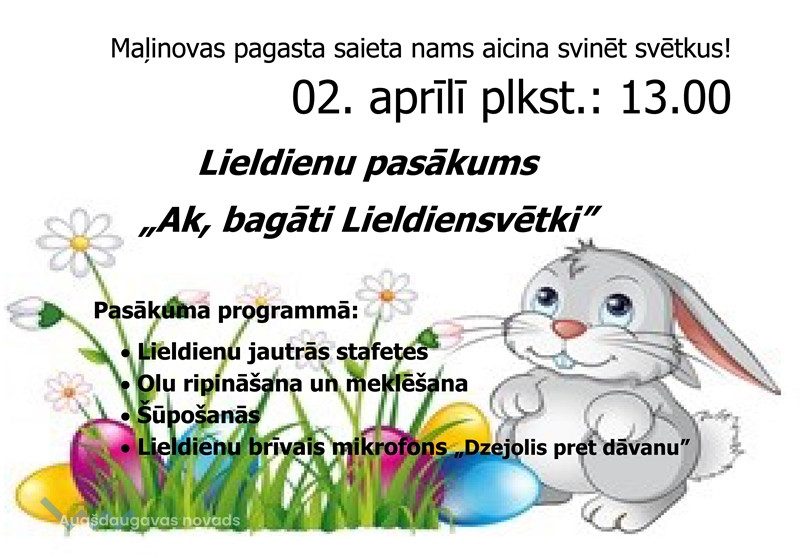 2.aprīlī plkst. 13.00 Maļinovas pagasta saieta namā visi tiek aicināti svinēt LIELDIENAS kopā!