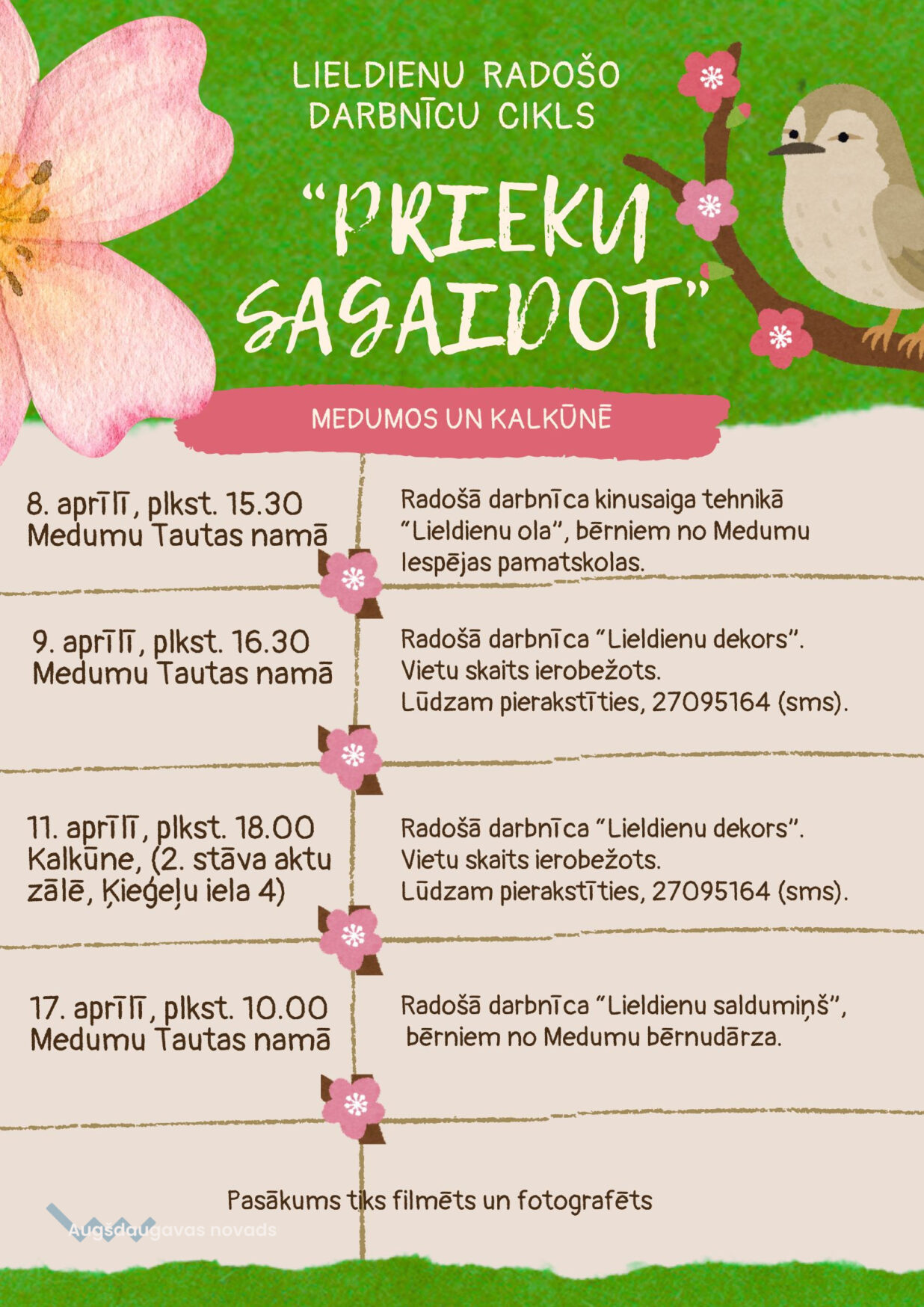 9. aprīlī plkst. 16.30 Medumu Tautas namā interesenti varēs piedalīties darbnīcā “Lieldienu dekors”, kurā tiks radīti svētku rotājumi. Tā kā vietu skaits ir ierobežots, dalībnieki tiek aicināti iepriekš pieteikties, sūtot SMS uz 27095164.