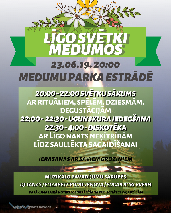 Aicināti visi līgotāji - gan no tuvākiem, gan no attālākiem ciemiem, lai 23. jūnijā plkst. 20:00 Medumu pagasta parka estrādē sanāktu uz Līgo svētkiem!
