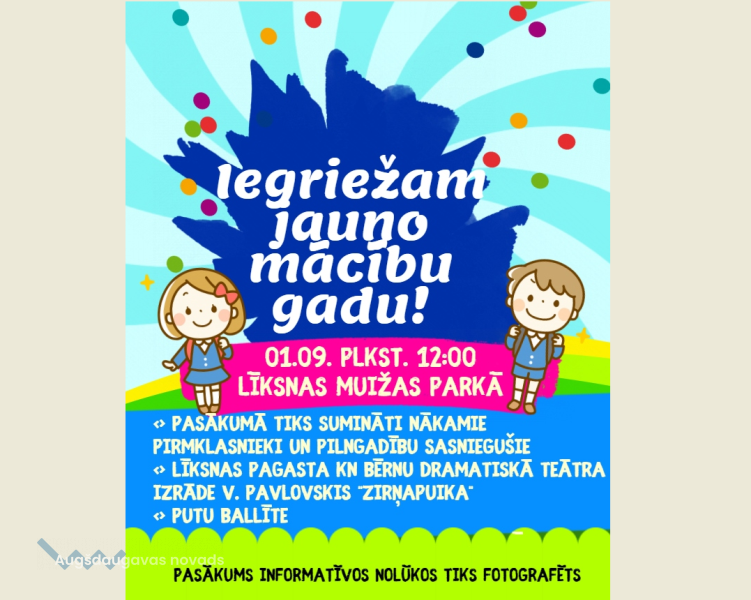 Līksnā iegriezīs jauno mācību gadu27.08.2018AKTUĀLI 1.septembrī plkst. 12.00 Līksnas Muižas parkā notiks nākamo pirmklasnieku un pilngadību sasniegušo sumināšana. Līksnas pagasta kultūras nama dramatiskā teātra izrāde "Zirņupuika" un Putu ballīte.