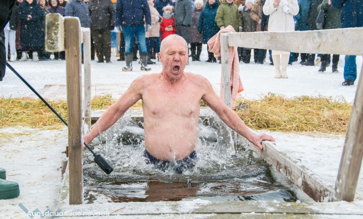 Luknas ezera krastā ļaudis iegremdējās ledus aukstajā ūdenī