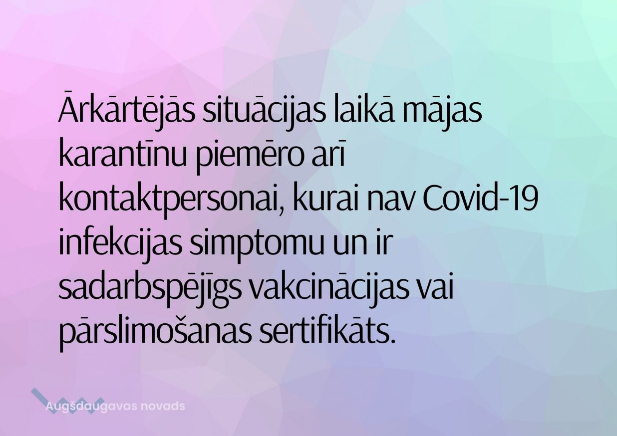 Pareiza Covid-19 pacientu un kontaktpersonu rīcība ir izšķiroši svarīga, lai nepieļautu infekcijas turpmāku izplatīšanos un samazinātu tuvinieku, kolektīvu locekļu un citu cilvēku inficēšanās risku. Tāpēc SPKC aicina ikvienu personu, kurai ir konstatēta Covid-19 infekcija vai noteikts Covid-19 pacienta kontaktpersonas statuss stingri ievērot Ministru kabineta 2021. gada 28. septembra noteikumos Nr. 662 “Epidemioloģiskās drošības pasākumi Covid-19 infekcijas izplatības ierobežošanai” noteiktās attiecīgi izolācijas vai mājas karantīnas režīma prasības.