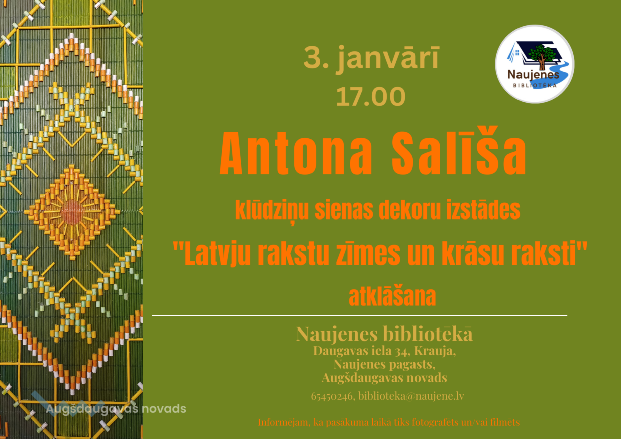 3. janvārī Naujenes bibliotēkā tiks atklāta preilēnieša Antona Salīša latvju rakstu dekora izstāde "Latvju rakstu zīmes un krāsu raksti". Izstādē būs skatāmas un atpazīstamas latviešu tautas rakstu zīmes, kas stāsta par mūsu senču ticējumiem un vērtībām.