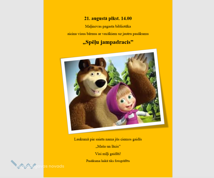 Maļinovā, 21. augustā plkst.14.00, tiek aicināti visi bērni ar vecākiem uz jautru pasākumu "Spēļu jampadracis". Bērnus izklaidēs "Maša un lācis".