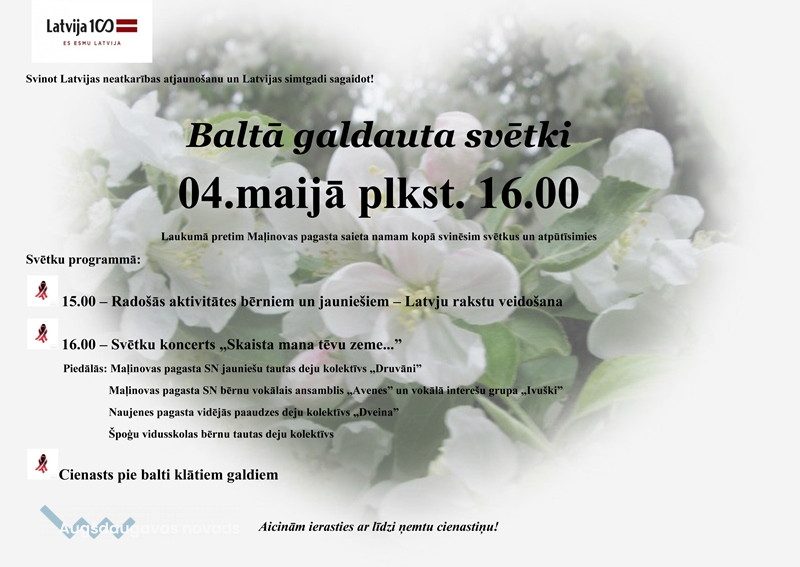 Maļinovas pagasta pārvaldes Saieta nams aicina!25.04.2018AKTUĀLI 4. maijā plkst. 16.00 Maļinovas pagasta pārvalde aicina kopīgi svinēt Baltā galdauta svētkus, lai atzīmētu Latvijas Republikas neatkarības atjaunošanas gadadienu!