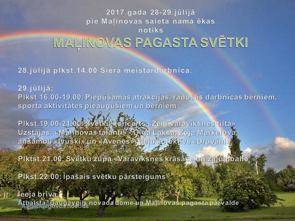 Maļinovas pagasta pārvalde aicina apmeklēt Maļinovas pagasta svētkus! Jūs gaida dažādas aktivitātes un pārsteigumi. Laipni gaidām Maļinovā!