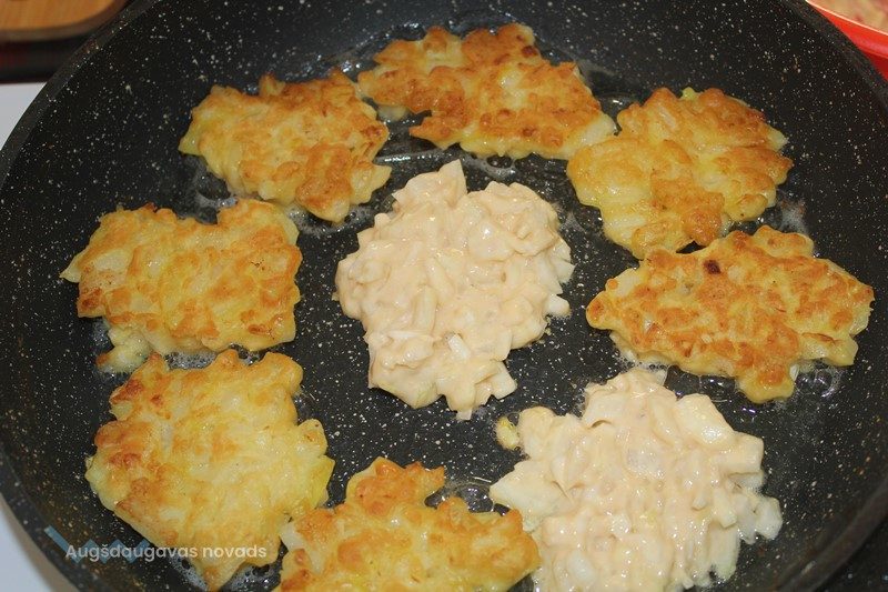 2 lielas sīpolu galviņas smalki sagriež, liek bļodā, kur pievieno 2 olas, 2 ēd. karotes majonēzes, 2 tējk. cepamā pulvera un 3 ēd.k. miltu. Pievieno sāli un garšvielas pēc garšas. Cep ar mīlestību!