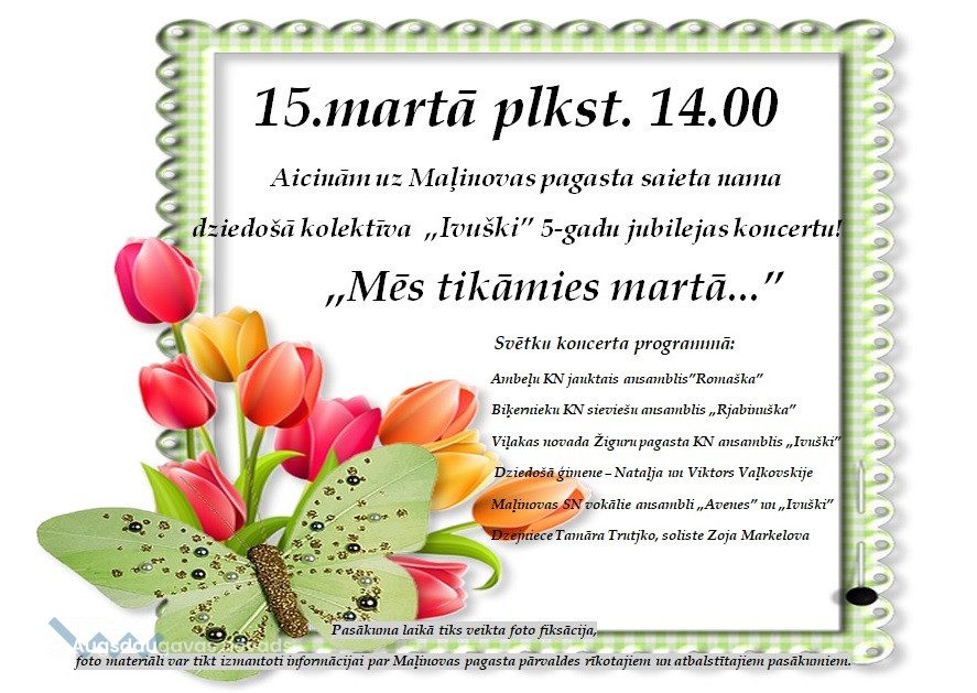 Ielūdzam Jūs uz pagasta SN dziedošā kolektīva „Ivuški” 5-gadu jubilejas koncertu “Mēs tikāmies martā...”, piektdien, 15.martā plkst. 14.00.