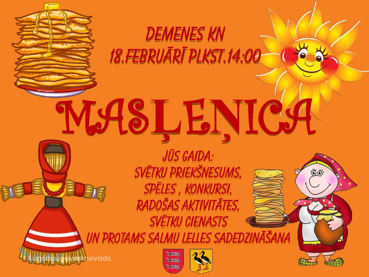 18. februārī plkst. 14.00 Demenes kultūras nams aicina visus pagasta iedzīvotājus un viesus kopā aizvadīt ziemu un ieskandināt pavasari. Jūs gaida svētku priekšnesums, spēles, konkursi, radošas aktivitātes, svētku cienasts un, protams, salmu lelles sadedzināšana.