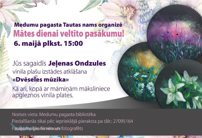 6. maijā plkst. 15:00 sadarbība ar Salienas Tautas namu, Medumu bibliotēkā notiks pasākums veltīts mātes dienai. Atklāsim mākslinieces Jelenas Ondzules vinila plašu izstāde “Dvēseles mūzika” (izstādē būs apskatāma no 06.05. līdz 31.05.) Pēc atklāšanas, brīvā noskaņā māksliniece kopā ar māmiņām apgleznos vinila plates, klausoties veco patifonu. Piedalīties varēs tikai pēc iepriekšējā pieraksta pa tālr.: 27095164.
