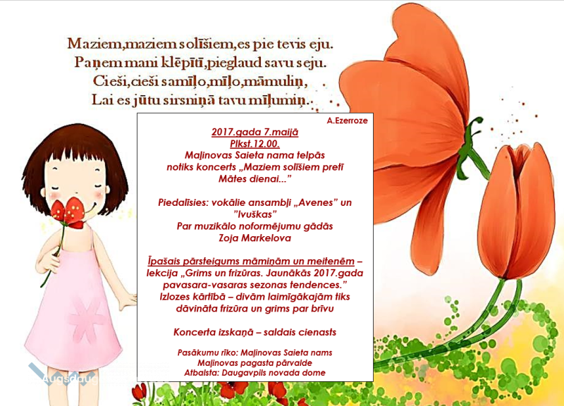 7. maijā plkst.12.00 Maļinovas Saieta nams un Maļinovas pagasta pārvalde aicina visus pagasta iedzīvotājus un ciemiņus pavadīt darba nedēļas nogali, apmeklējot koncertu „Maziem solīšiem pretī Mātes dienai...”, aizdomājoties par visdārgāko dārgumu pasaulē – Māti....