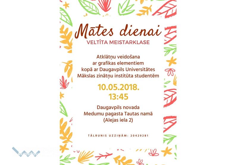 Aicinām pēc izstādes atklāšanas “MELNS. BALTS. +” Medumu pagasta Tautas namā š.g. 10.maijā plkst. 13:30 apmeklēt meistarklasi veltītu Mātes dienai. Kopā ar Daugavpils Universitātes Mākslas zinātņu institūta studentēm veidosim atklātnes izmantojot grafikas elementus. Iedvesmu varēsim it īpaši rast lielajā skaitā darbu, kuri būs skatāmi izstādē.