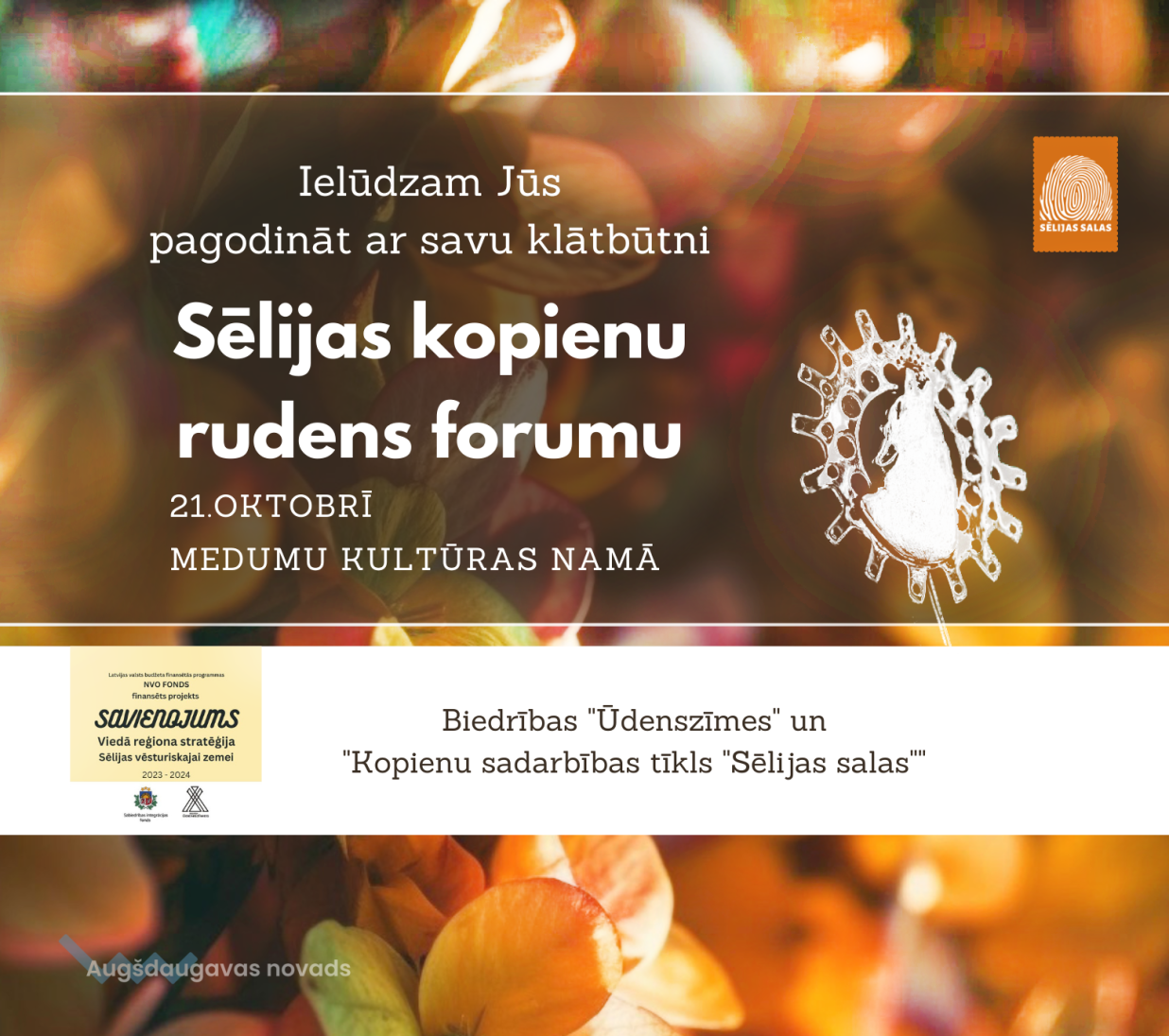 Sēlijas nevalstisko organizāciju forumu organizē biedrība “Ūdenszīmes” un kopienu sadarbības tīkls “Sēlijas salas” projekta “Savienojums. Viedā reģiona stratēģija Sēlijas vēsturiskajai zemei” ietvaros Tā norisi finansiāli atbalsta Sabiedrības integrācijas fonds no Kultūras ministrijas piešķirtajiem Latvijas valsts budžeta līdzekļiem.