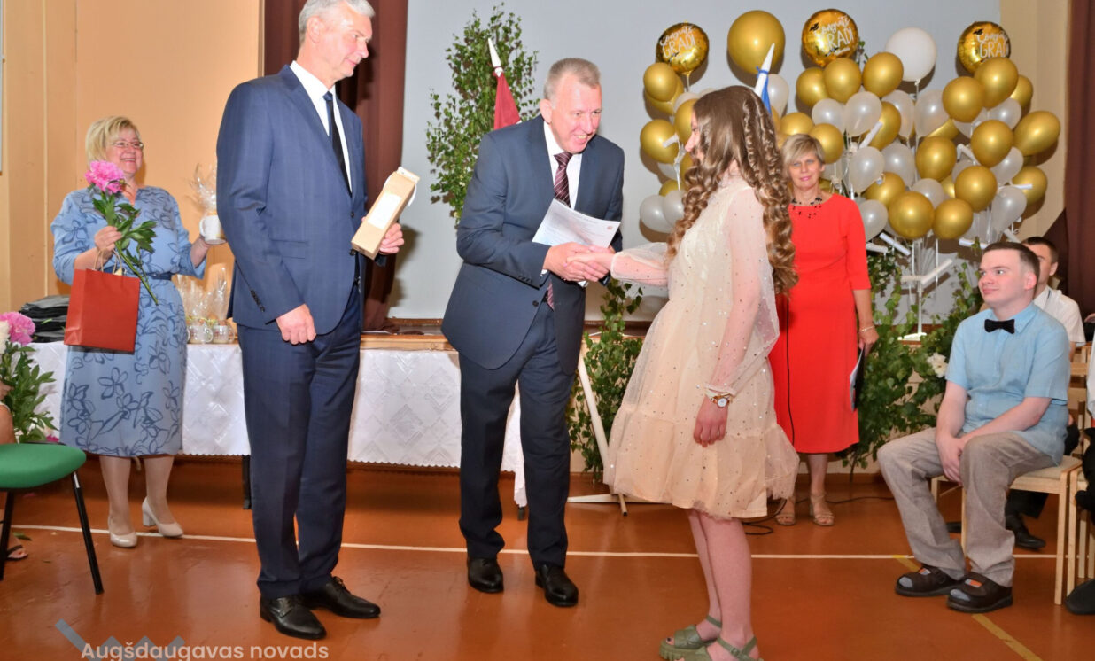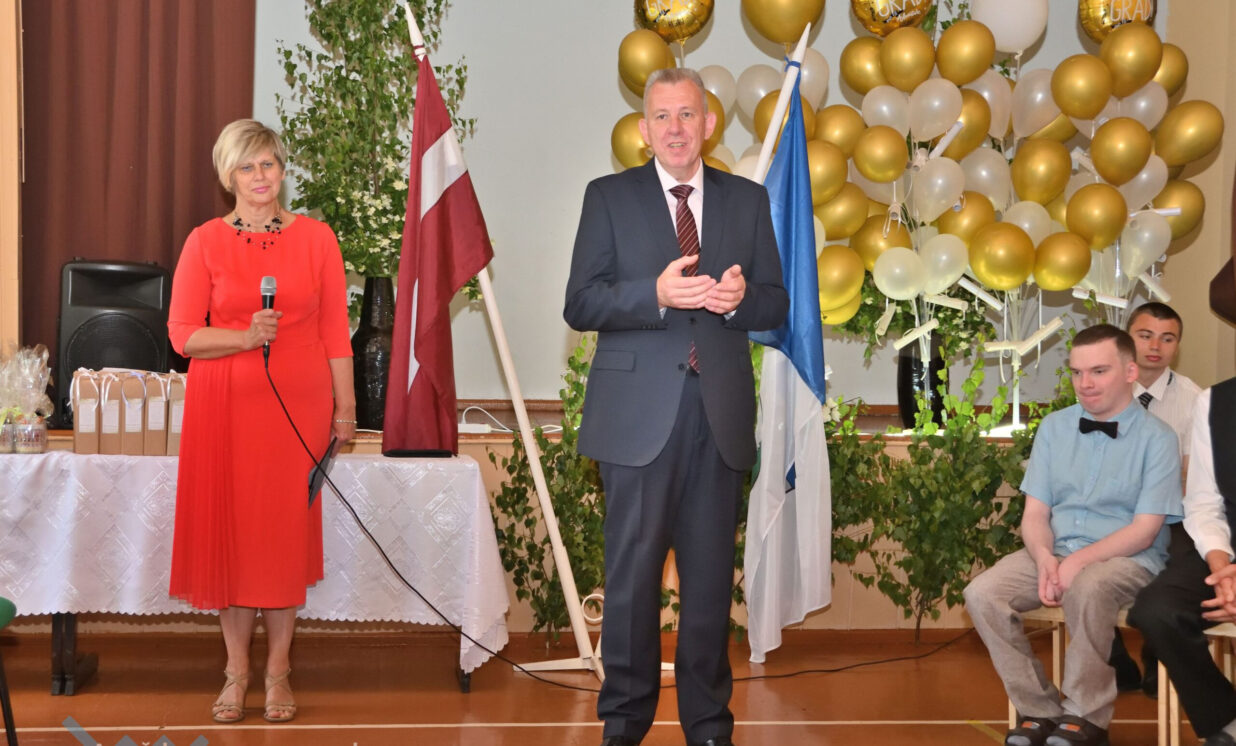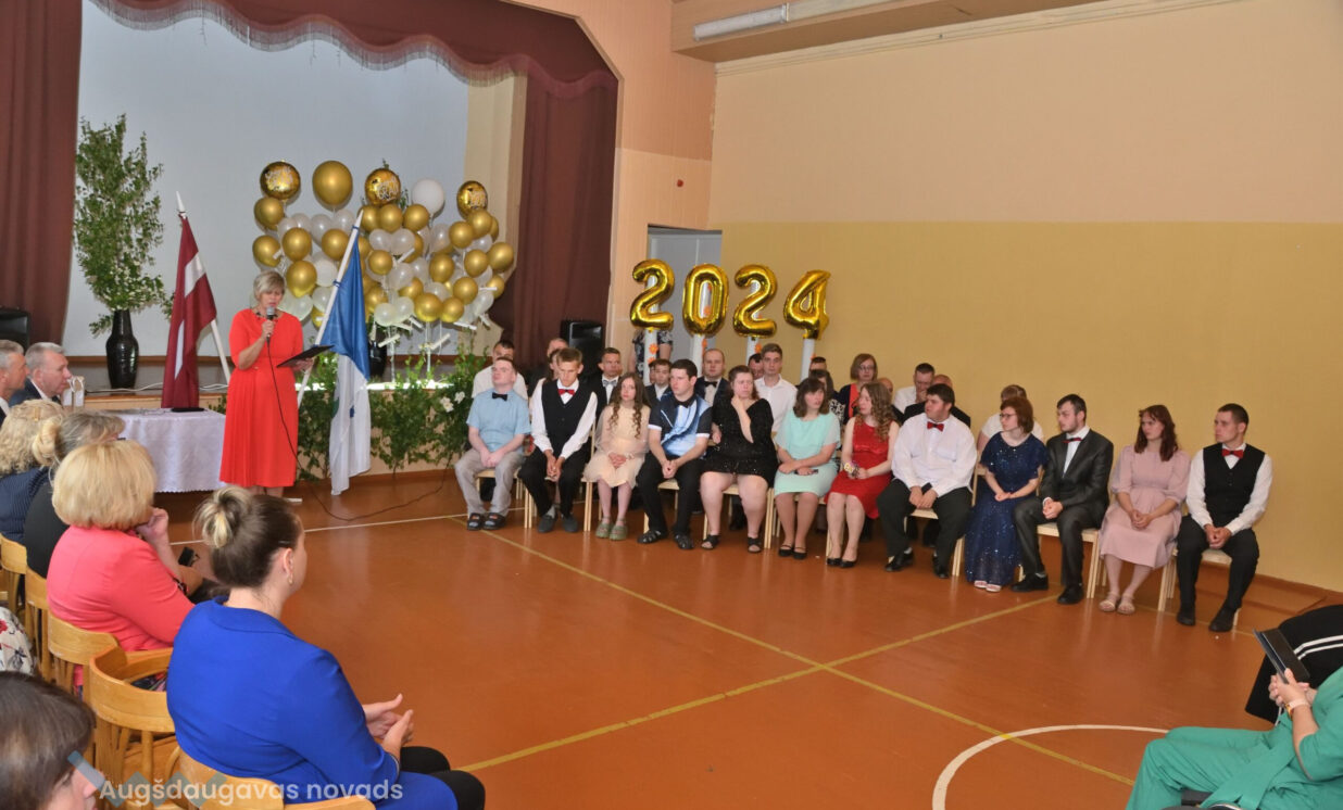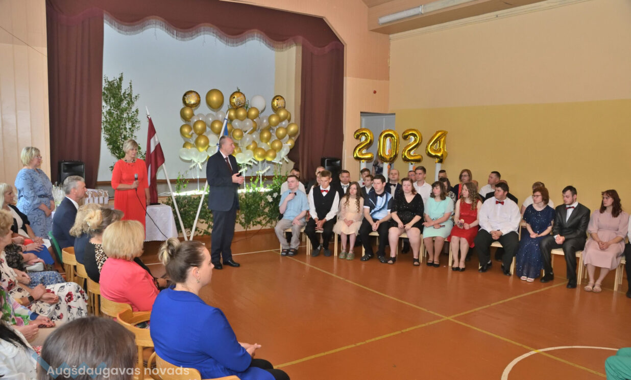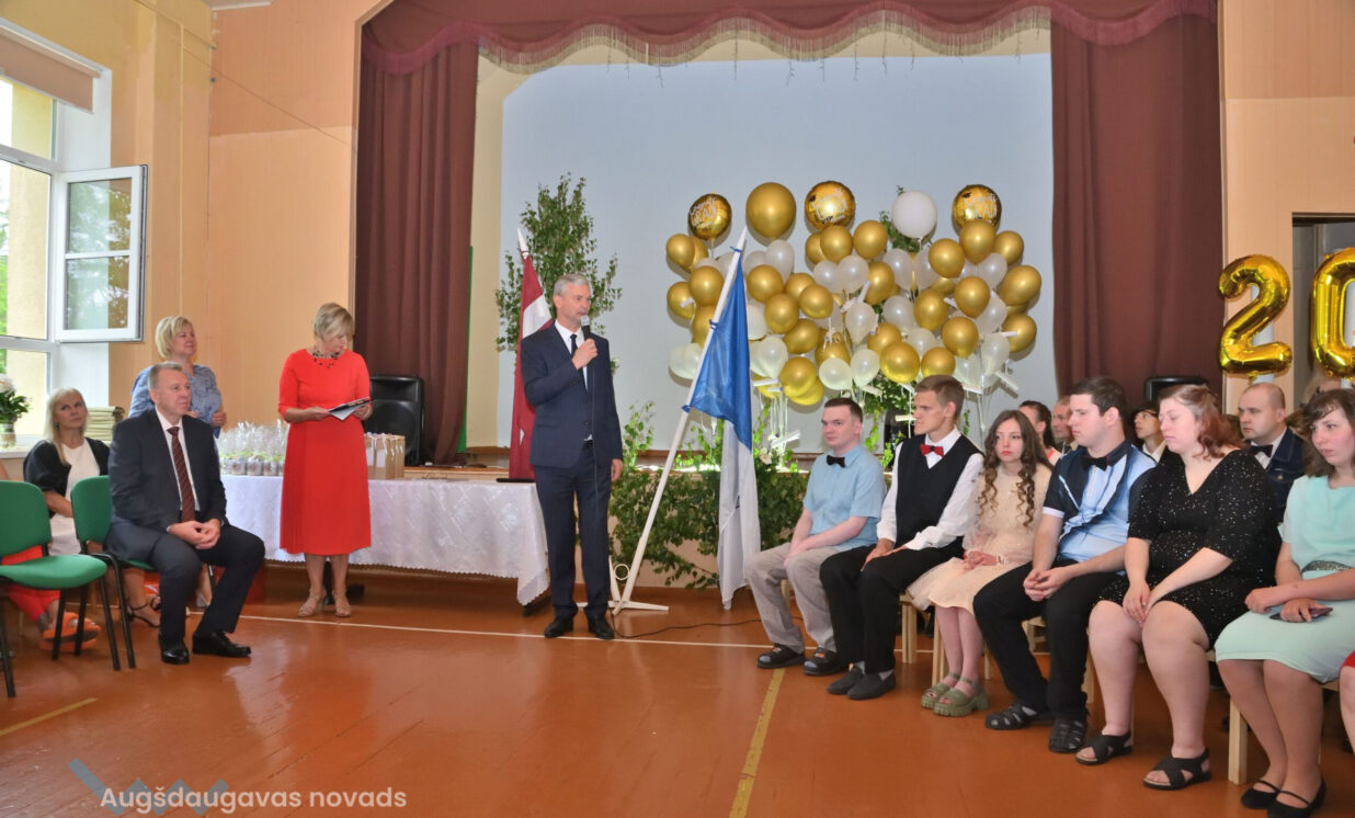 Absolventus, skolotājus un visus klātesošos uzrunāja Augšdaugavas novada pašvaldības domes priekšsēdētāja vietnieks Vitālijs Aizbalts: “Man liels prieks būt šeit – Iespēju skolā! Vai izmantosiet jums dotās iespējas – atkarīgs tikai no jums, absolventiem. Pašvaldība pēc iespējas rūpējas par skolu, piemēram, lieliski darbojas jaunā, automatizētā katlumāja, kura tika uzstādīta pagājušgad. Šogad uzsāksim vēl vienu projektu pamatskolas ēku pārbūvei. Darām visu iespējamo sarežģītajos finansiālajos apstākļos.” V. Aizbalts arī izteica pateicību vecākiem par to, ka viņi iegulda lielus pūliņus bērnu audzināšanā.