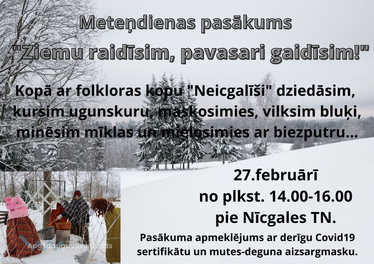 27. februārī, no plkst. 14.00 - 16.00 pie Nīcgales Tautas nama, kopā ar folkloras kopu "Neicgalīši" dziedāsim, kursim ugunskuru, maskosimies, vilksim bluķi, minēsim mīklas un mielosimies ar biezputru.