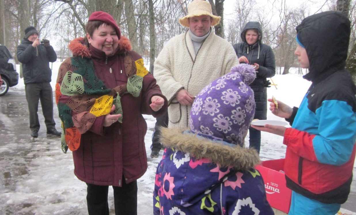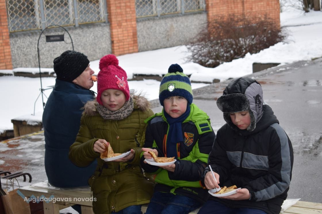 Kad meteņbērni bija veiksmīgi spēkojušies, visi varēja mieloties ar Līksnas pagasta aktīvo sieviešu apvienības “Saules taka” sarūpētajām pankūkām, zirņiem un tēju.