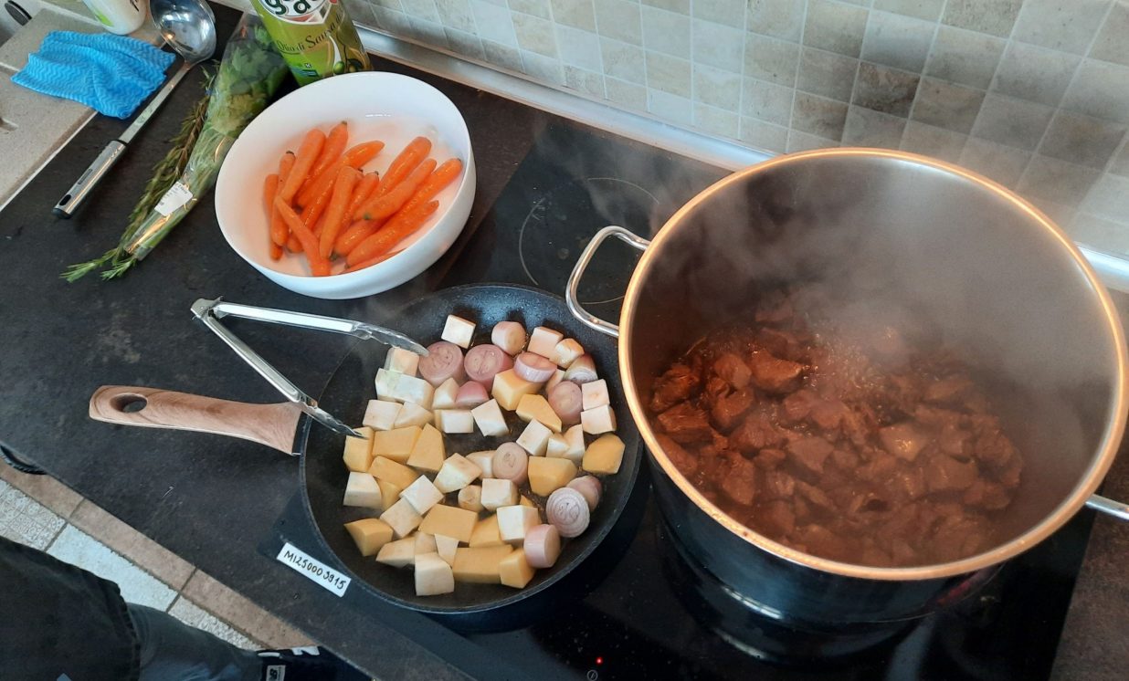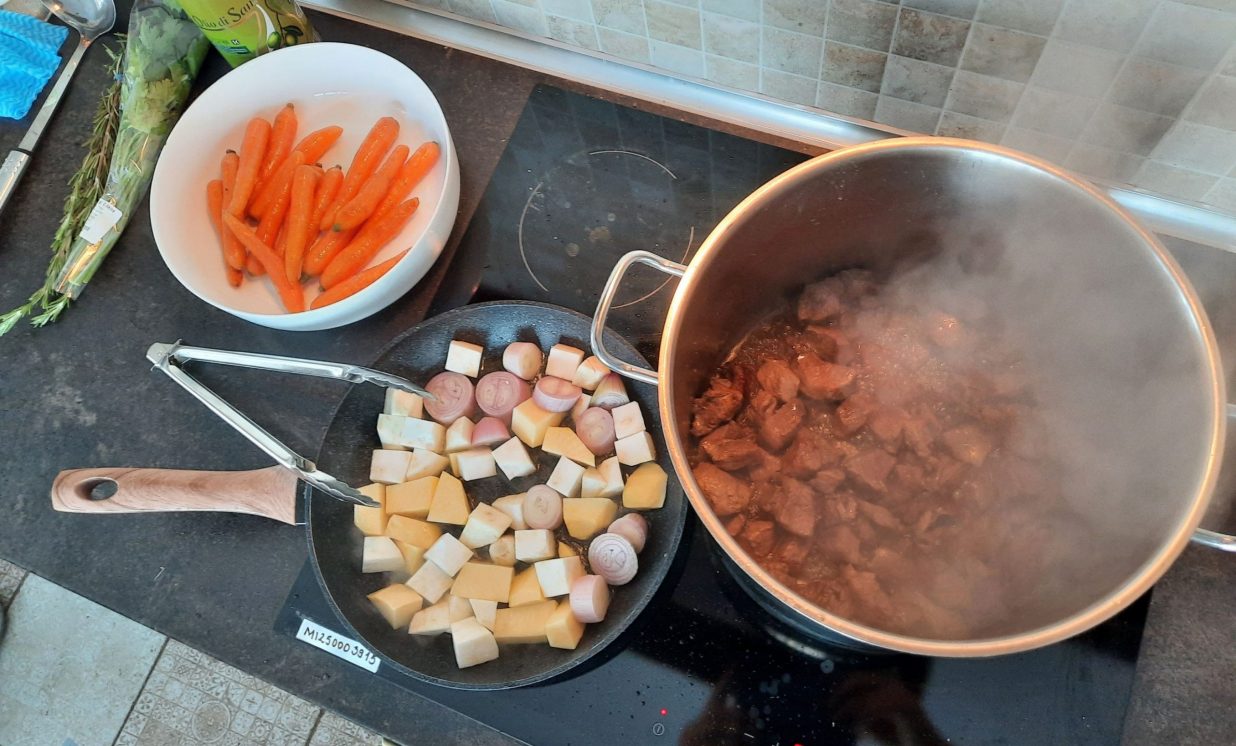 Pamatēdienā tapa gatavots aļņa gaļas sautējums ar dārzeņiem un sēnēm. Pirms sautēšanas gaļa jāsagriež palielos gabalos un kārtīgi jāapcep pannā lielā eļļas daudzumā. Atsevišķi apcep arī dārzeņus - sīpolus, burkānus un selerijas sakni. Pavārs piekodina, ka gan zupām, gan sautējumiem visas sastāvdaļas vispirms kārtīgi jāapcep, jo tad saglabāsies īstā krāsa un garša.