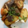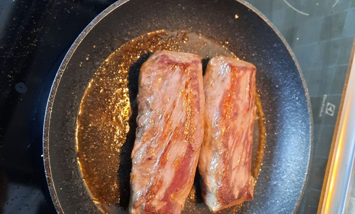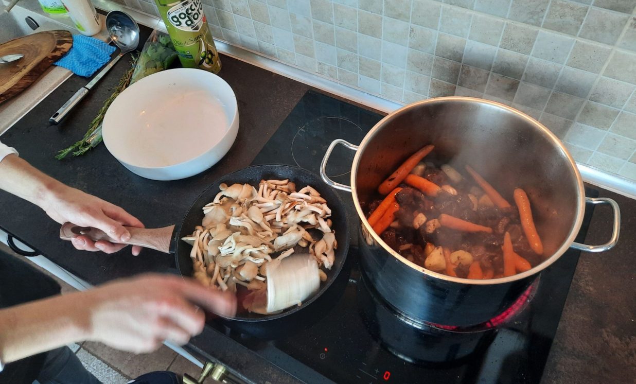 Lai gaļa būtu aromātiskāka, pavārs iesaka tai cepšanas procesā pievienot vīnu, turklāt noderēs jebkurš vīns, arī no tetrapakas. Lai sautējuma garšu padarītu interesantāku, tam pievieno apceptas sēnes, šajā gadījumā tika izmantotas austersēnes un kokpūkaines, kas nāk nevis no meža, bet audzētavām. Visas apceptās sastāvdaļas liek katlā, uzlej ūdeni, pievieno rozmarīnu vai timiānu, kas vislabāk der medījumam. Tad rūpīgi nosedz katlu ar foliju un liek krāsnī uz pāris stundām.