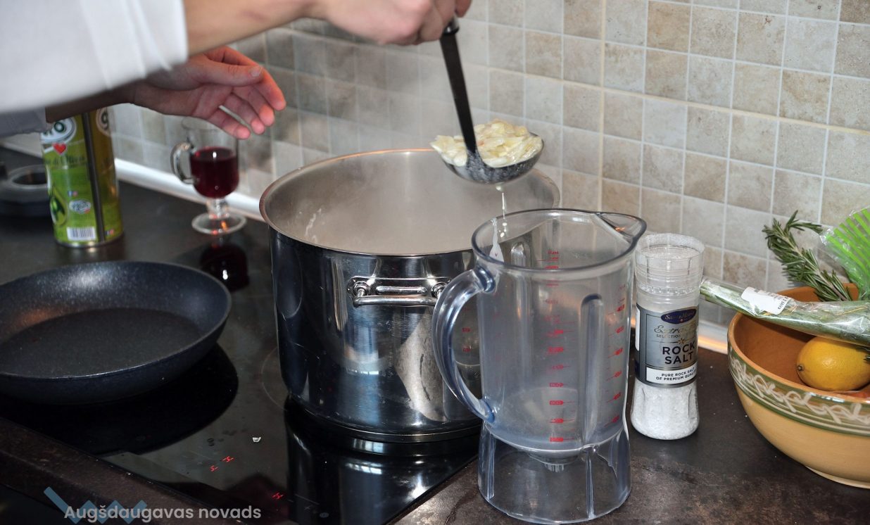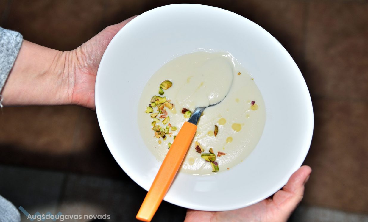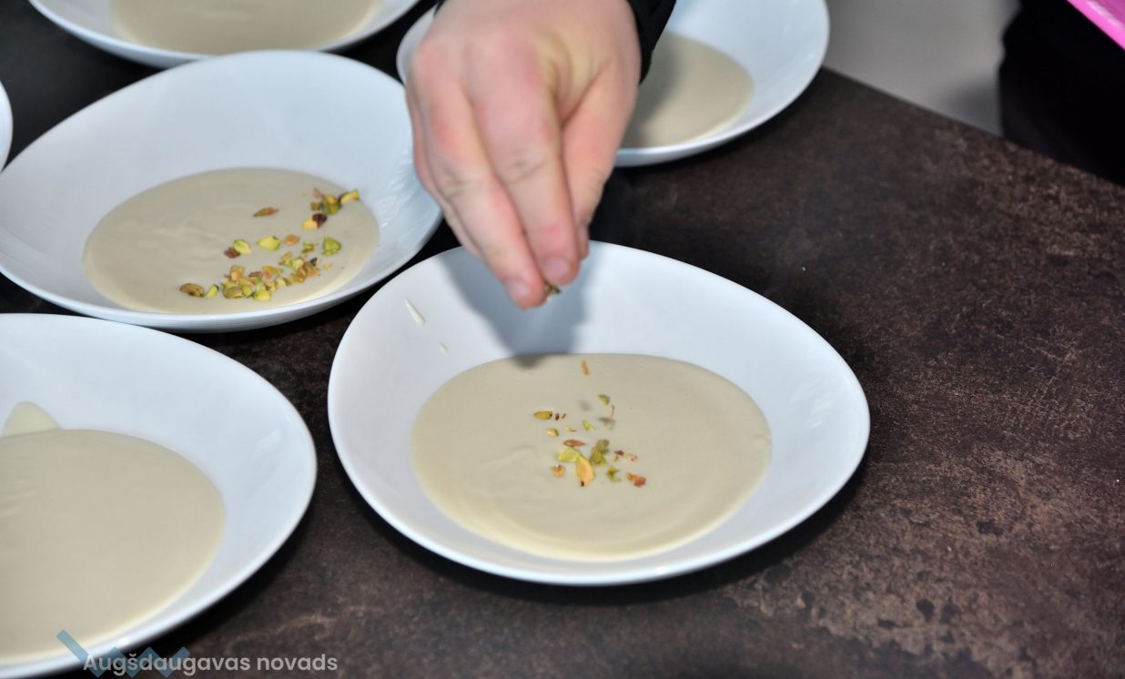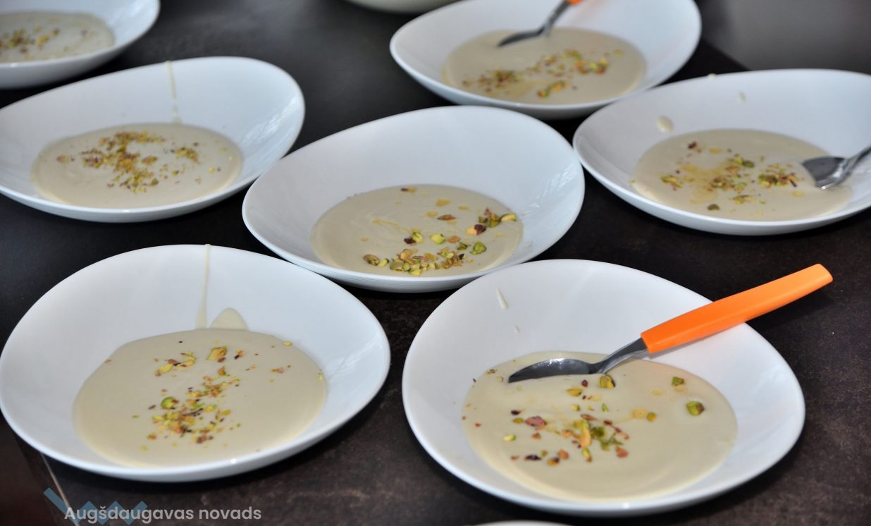 Pirmā tapa topinambūru biezzupa. Gatavošanas procesā klātesošie uzzināja daudzus interesantus un noderīgus knifiņus, kā pareizi sagriezt un apstrādāt produktus, lai tie saglabātu pēc iespējas vairāk vērtīgu uzturvielu, kādas garšvielas un kurā brīdī labāk pievienot ēdienam, lai to nesabojātu, bet tikai uzlabotu garšu.