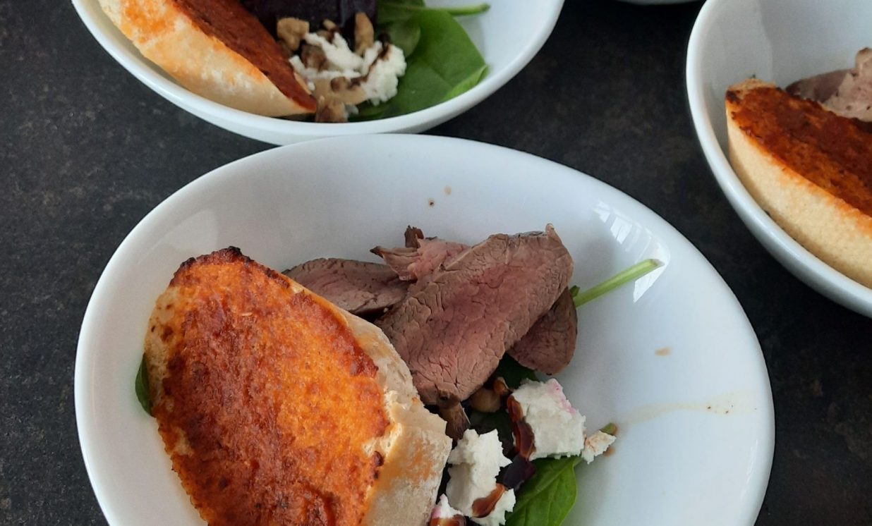 Uzkodai pavārs gatavoja biešu salātus ar valriekstiem, kazas sieru un stirnas cepeti, kam klāt pasniedz franču baltmaizes grauzdiņus ar pesto mērci. Haralds atklāj, ka fileja vai karbonāde ir vienīgās izgriezuma daļas medījumiem, kurus var ēst praktiski jēlus, un pastāstīja, kā var noteikt cepeša gatavības pakāpi. Stirnas gaļa tiek apcepta ļoti viegli, iekšpusē paliekot pusjēla. Jau gatavu apceptu gaļu piparo un sāla, nežēlojot garšvielas, jo gaļa paņems tik daudz, cik tai vajag. Cepetim ļauj nedaudz atdzist, jo, griežot karstu, gaļa zaudēs sulīgumu.