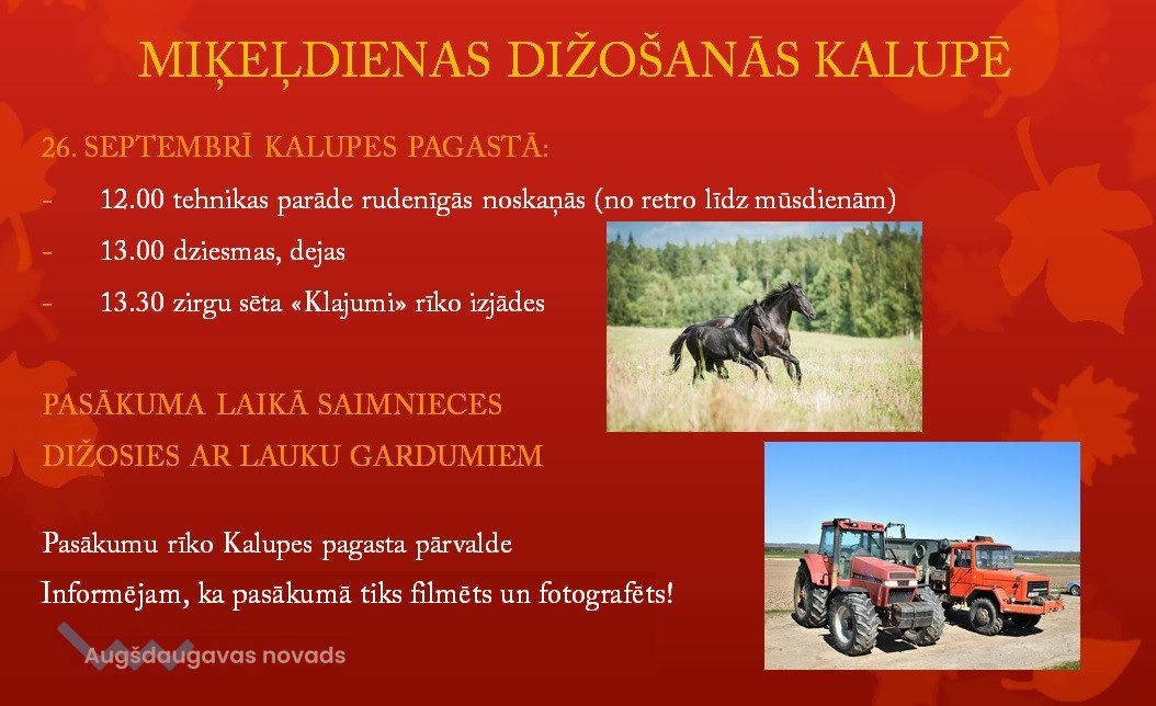 26. septembrī, Kalupē, no plkst. 12.00 - 13.00 notiks tehnikas parāde rudenīgās noskaņās - no retro līdz mūsdienām (ceļā, kas pretī ,,Top” veikalam).