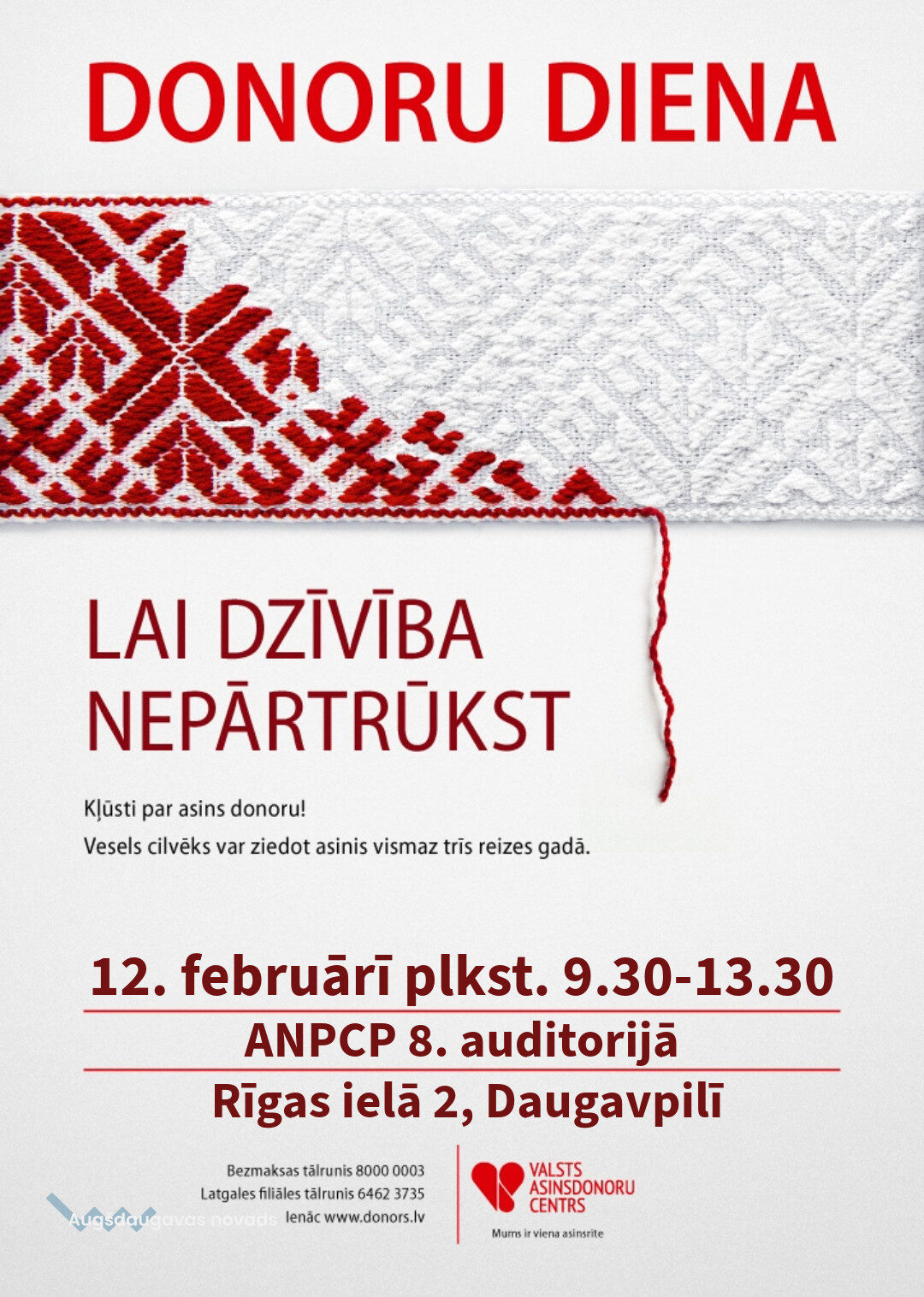 12. februārī no plkst. 9.30 līdz 13.30 Augšdaugavas novada pašvaldības Centrālās pārvaldes ēkas 8. auditorijā, Rīgas ielā 2, Daugavpilī, tiek organizēta Donoru diena, veltīta Mīlestības svētkiem - Svētā Valentīna dienai.