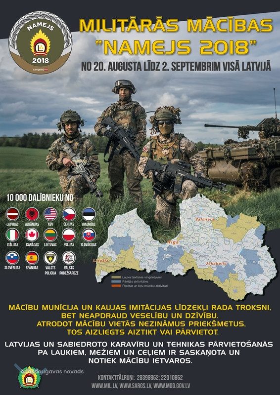 No 20. augusta līdz 2.septembrim visā Latvijā notiks līdz šim lielākās militārās mācības “Namejs 2018”, lai pārbaudītu un pilnveidotu Nacionālo bruņoto spēku gatavību izvērsties valsts aizsardzības uzdevumu izpildei kā patstāvīgi tā arī kolektīvās aizsardzības sistēmas ietvaros.