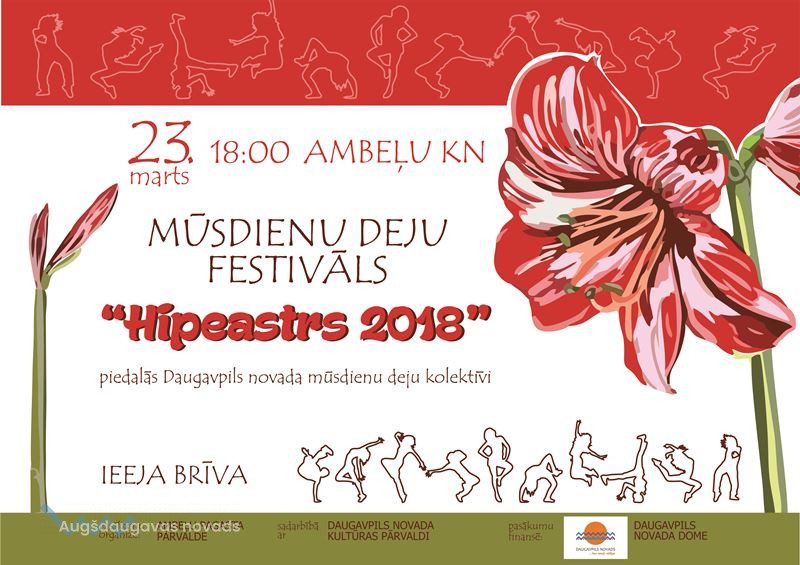 Mūsdienu deju festivāls “Hipeastrs 2018”22.03.2018AKTUĀLI 23. martā plkst. 18:00 Ambeļu kultūras namā notiks Daugavpils novada mūsdienu deju festivāls "Hipeastrs 2018". Festivālā ir pieteikušies 15 kolektīvi no Daugavpils novada un dejotāji no Krāslavas novada Indras Mākslas un mūzikas skolas.